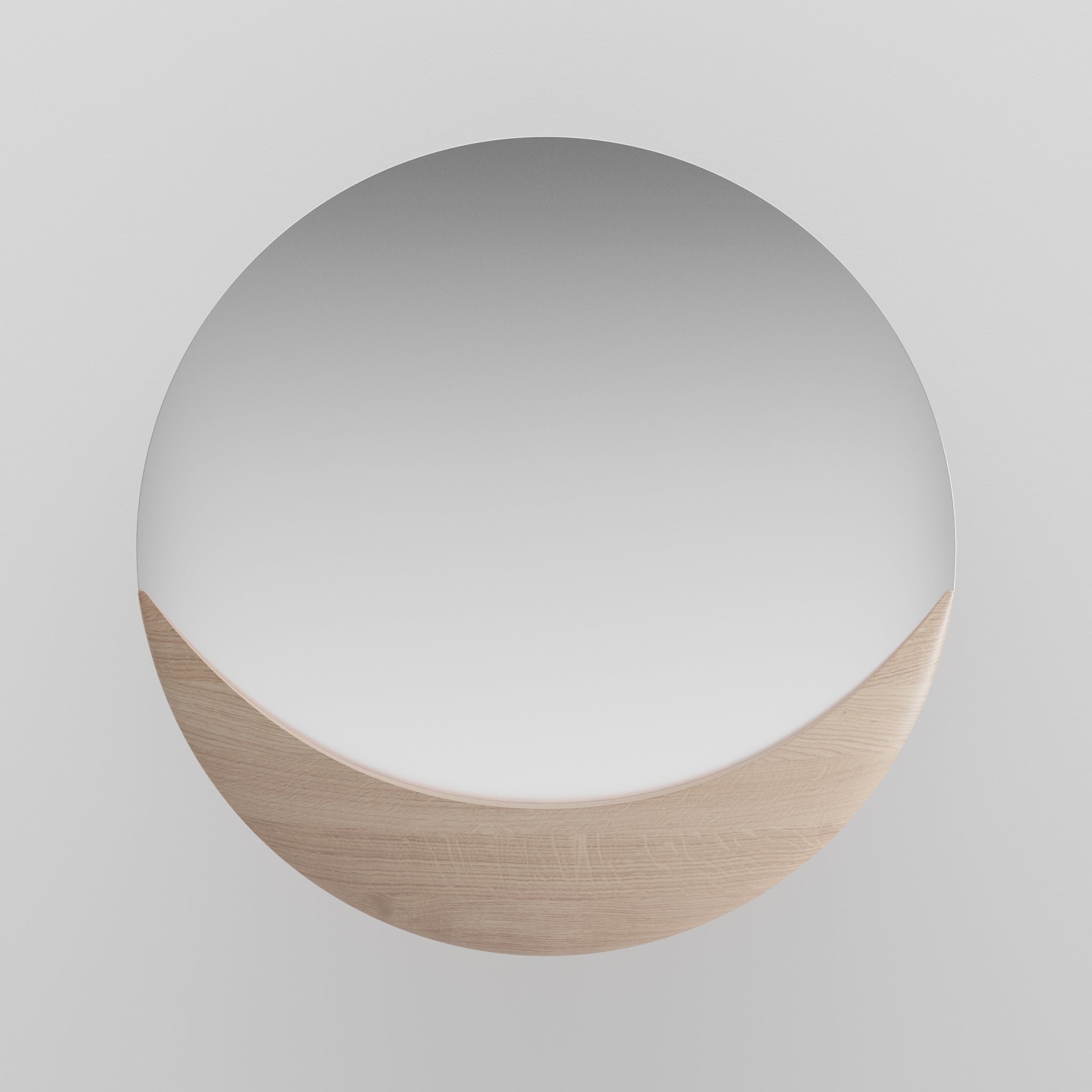The Artisan Luna Mirror features a round design with the bottom half framed in smooth, solid wood against a plain white wall, offering an eco-friendly and minimalist aesthetic.