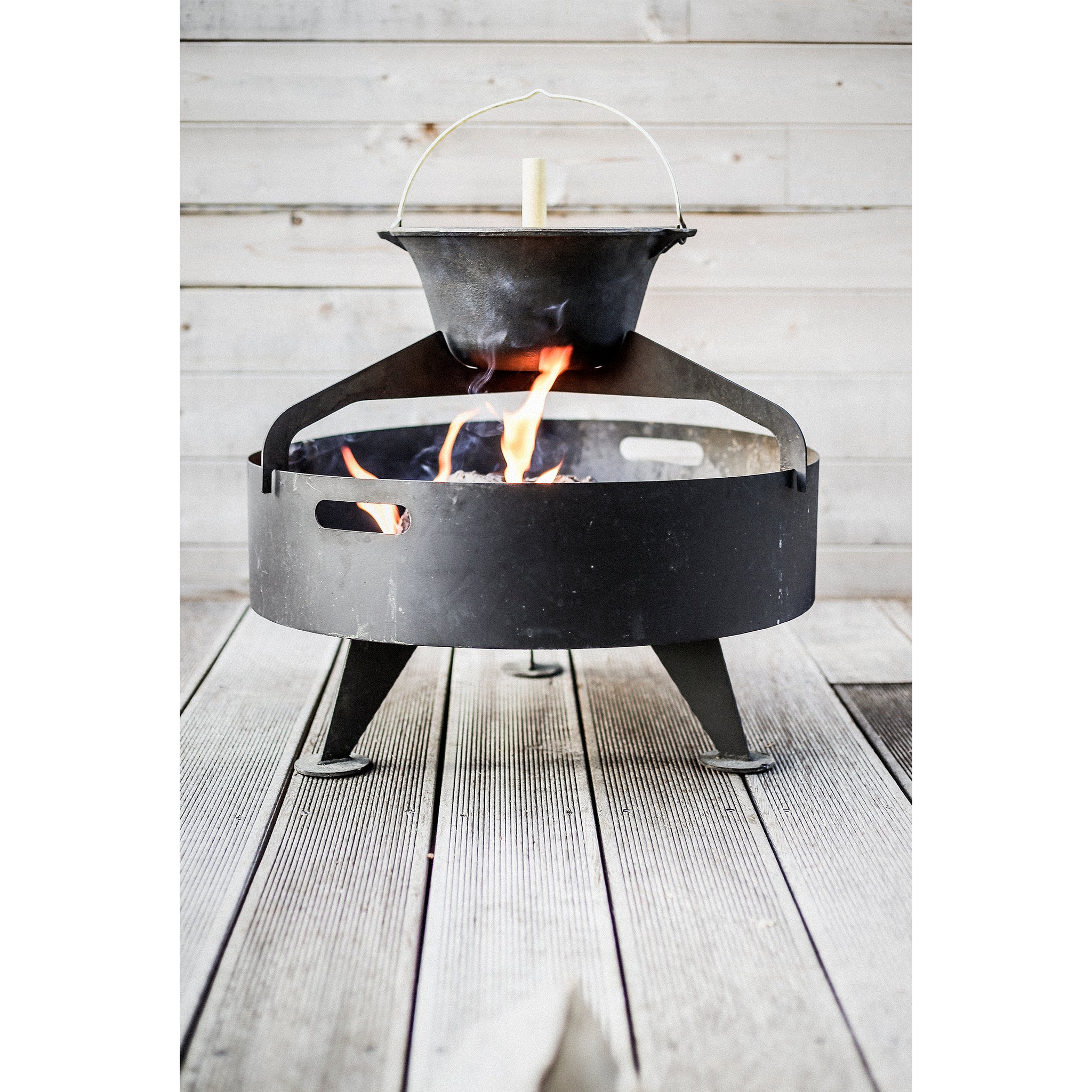 You can grill, cook, roast or simply just warm your palms above the fire… Like we said, fire somehow makes everything better. The fireplaces and grills are made out of steel with a fire-resistant colour finish. The legs of the grills as well as the shelves and the stacking area are made out of tropical wood or locust wood and the grid of the grill is made out of stainless steel. The pot set consists of a steel tripod, a cast iron kettle and enamel lid.