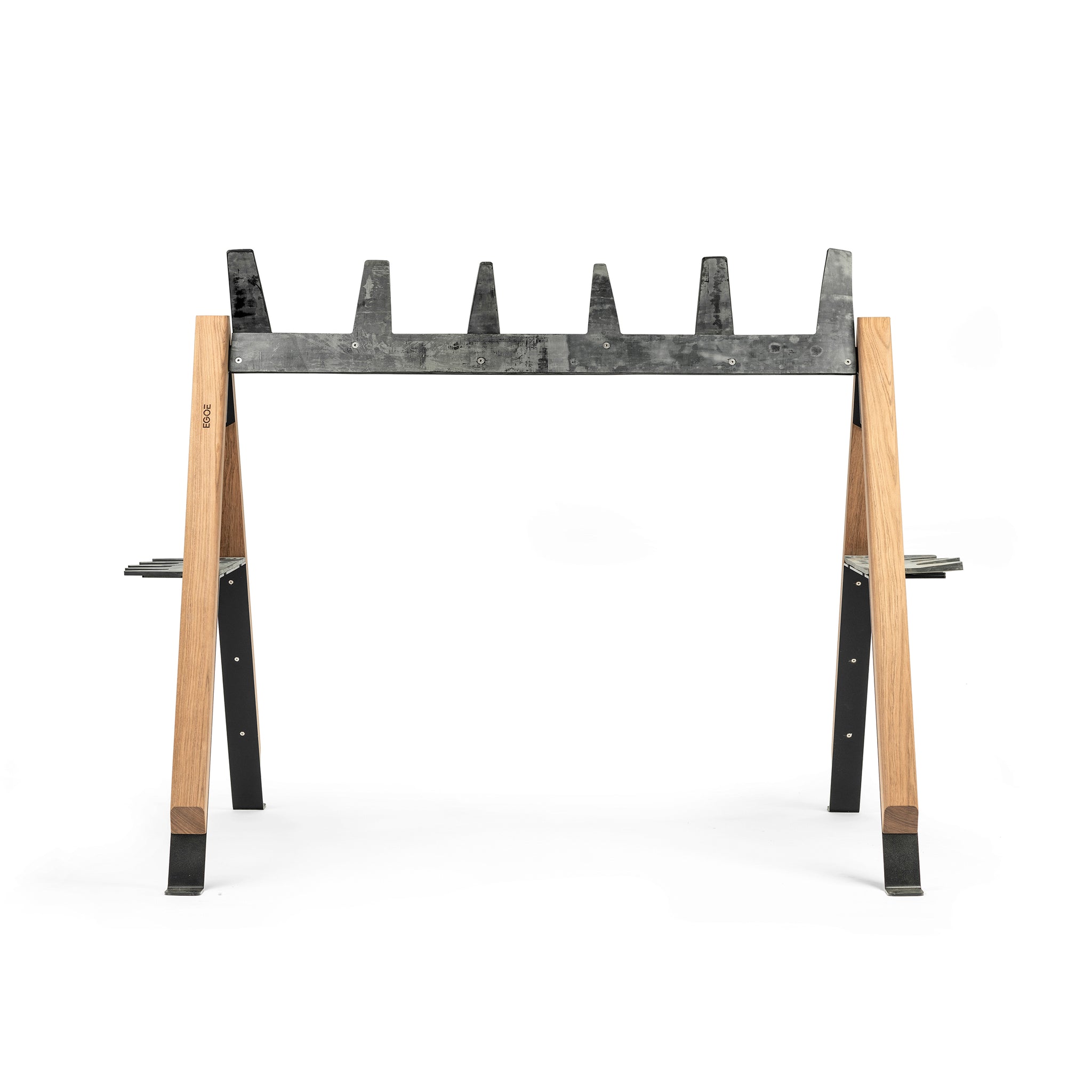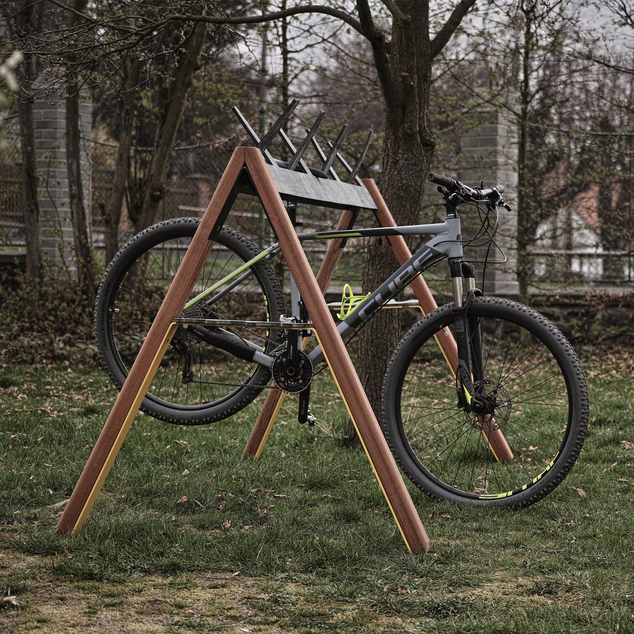 If you wish, we can add a sophisticated solution for a personal message or a banner. Wooden A-shaped walls joined by steel reinforcements with a rubber comb will serve well for children's skis. The comb on the top has practical rubber antlers designed for skis over 120 cm long. During the cycling season, it can easily take up to 10 bicycles.