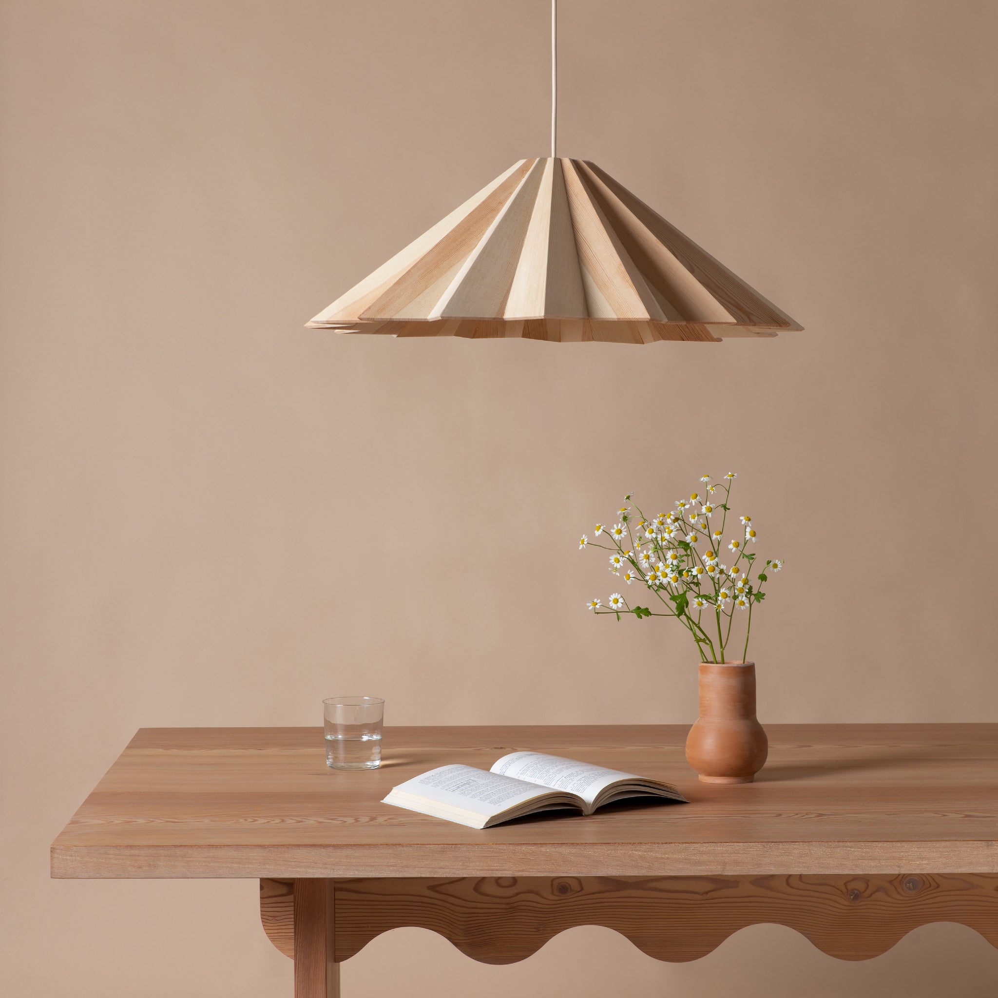 reminiscent of traditional folded textile lampshades, but its materiality and