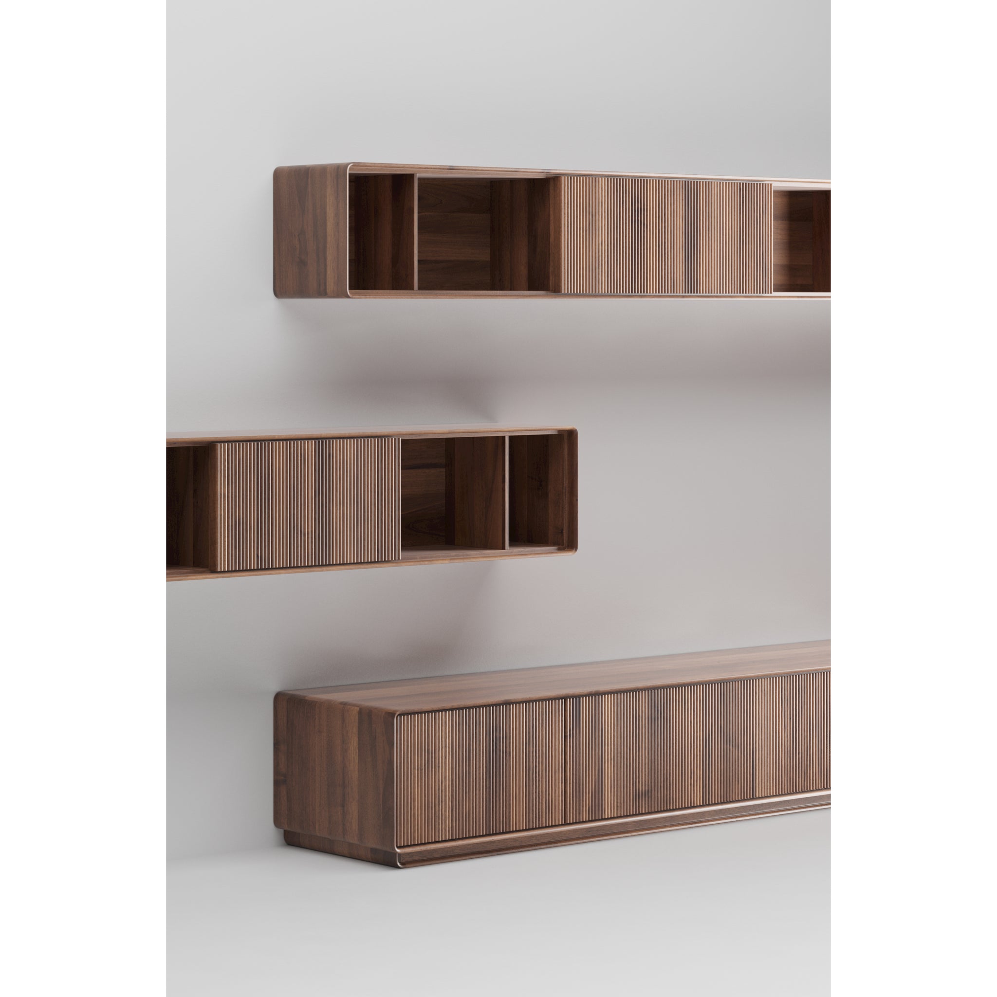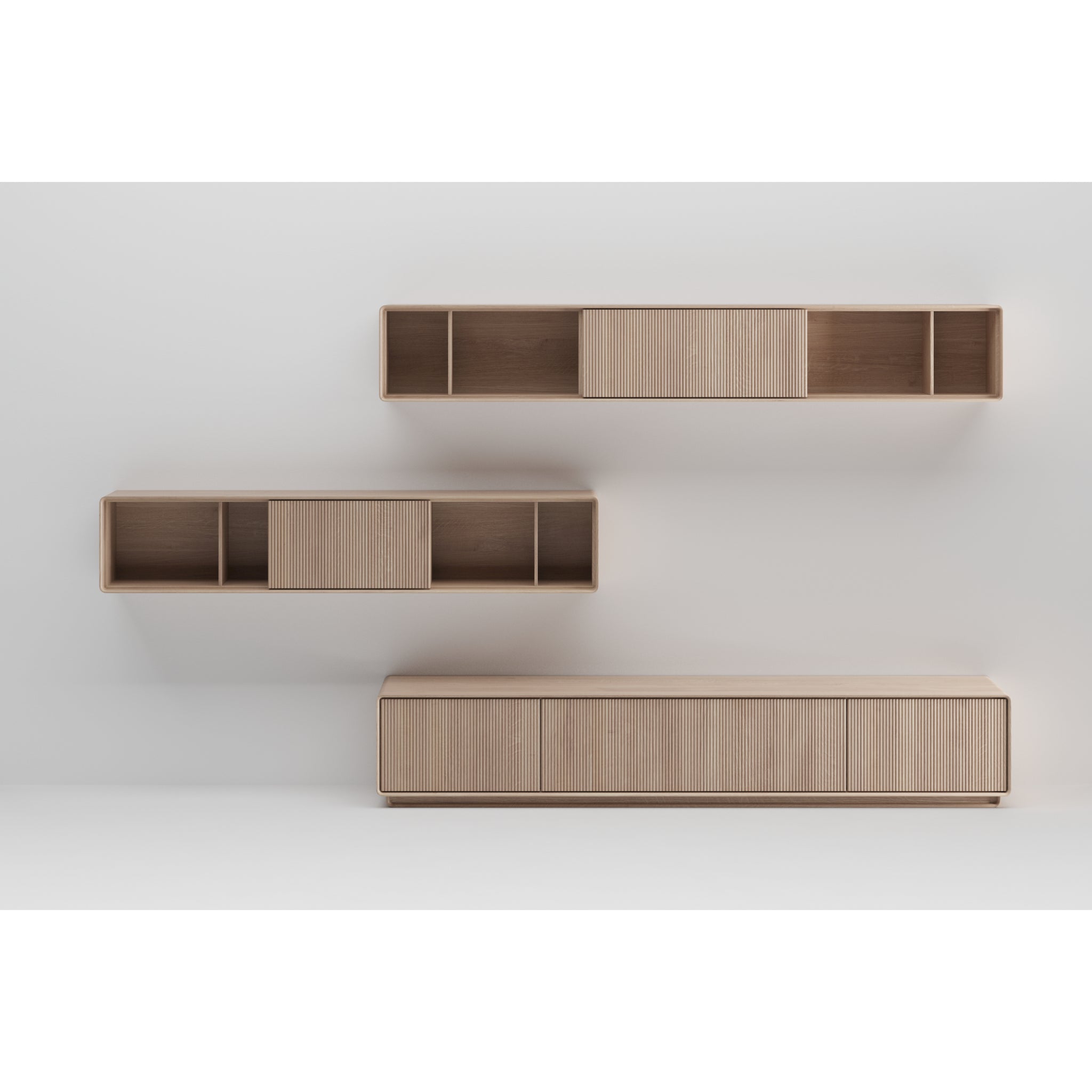 Top view of JANTAR Modular System by Artisan, showcasing elegant, minimalist wooden shelves on a white wall. Crafted from solid wood and finished with natural oils, the upper shelf has two open compartments while the lower one features three sections, including one with a ribbed sliding panel.