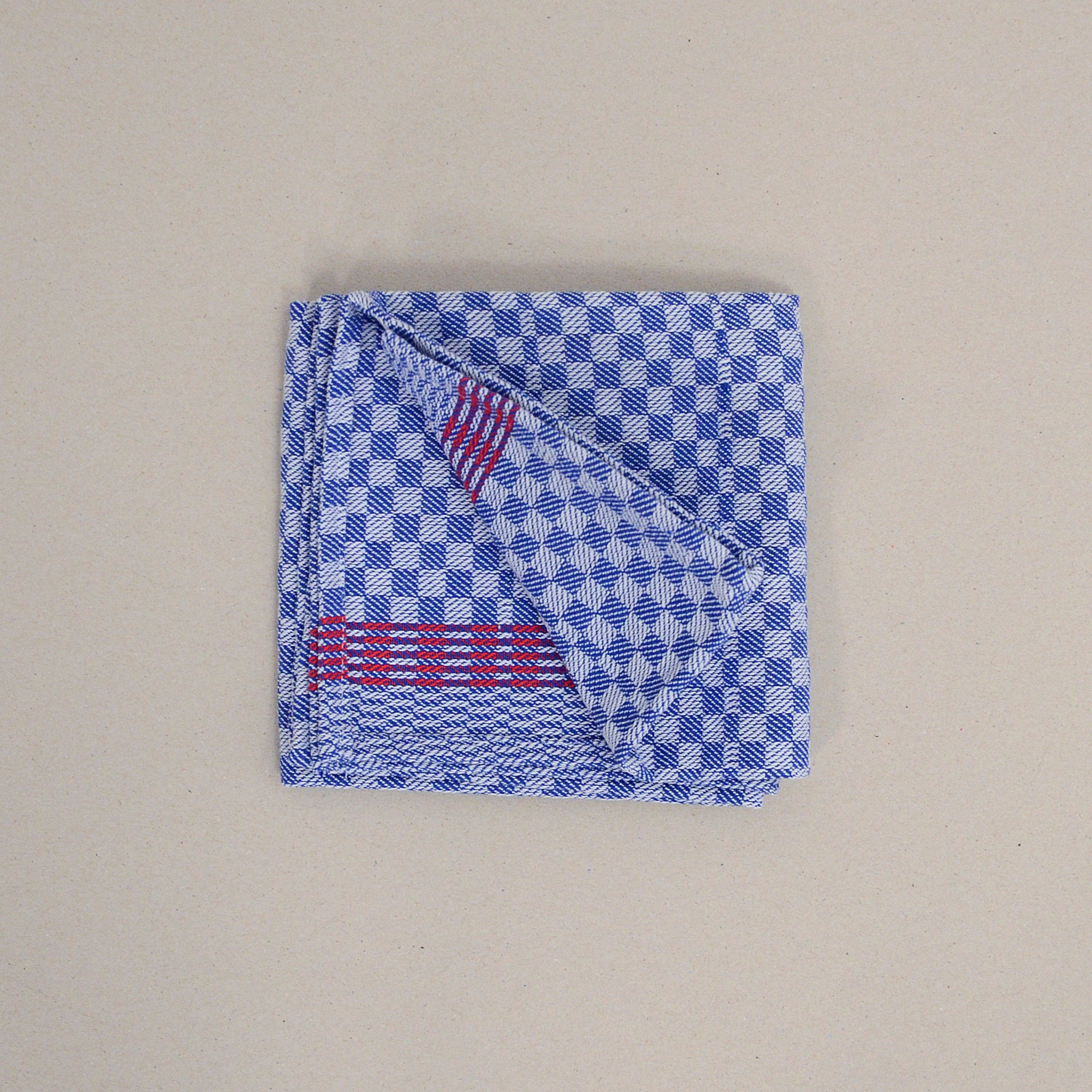 The product Dry by GoodGoods features a neatly folded cotton handkerchief in blue and white checkered pattern with a red detail at one corner, displayed on a plain beige background.