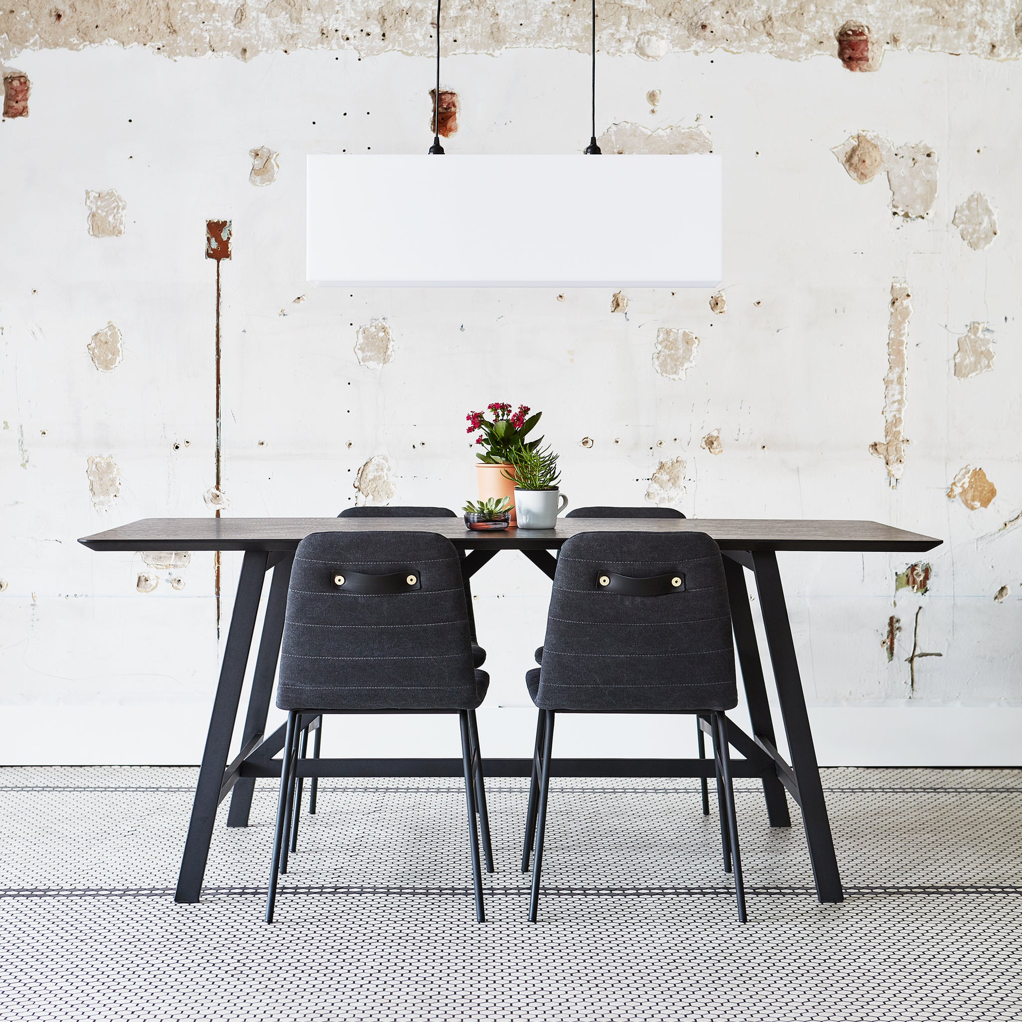 The Lecture Dining Chair is a modern reinterpretation of a classic elementary school chair design. This version features a one-piece, upholstered seat and back, with unique, channel-stitch detailing. Select upholstery is made from 100% recycled plastic bottles, diverted from landfills and waterways, then repurposed into upholstery material. The back incorporates a functional leather and brass handle. The black, powder-coated steel legs are reinforced with solid metal stabilizers. Functional, comfortable and stylish, the Lecture Chair works well for any workspace or dining area.
