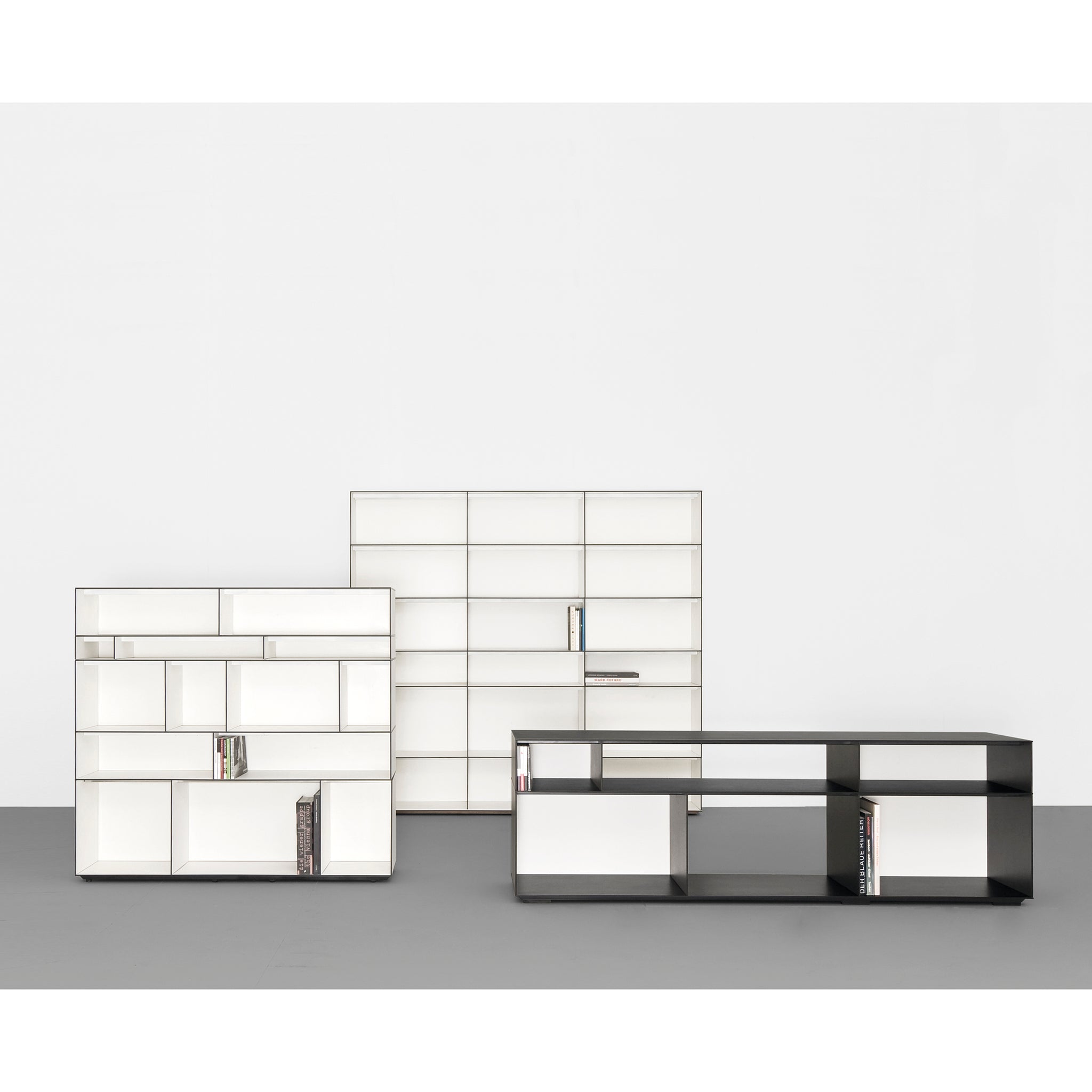 DIGITAL is modular sideboard- and shelf system. It is available in HPL black, HPL white with black edge or HPL white with white edge. Digital is available in two different depths and 12 different widths. It is mounted storywise. There are 4 different height options for those storeys. The elements are stackable and can be combined in different ways. The interior panels can also be of various types, straight, honeycomb-like or in a free way.
