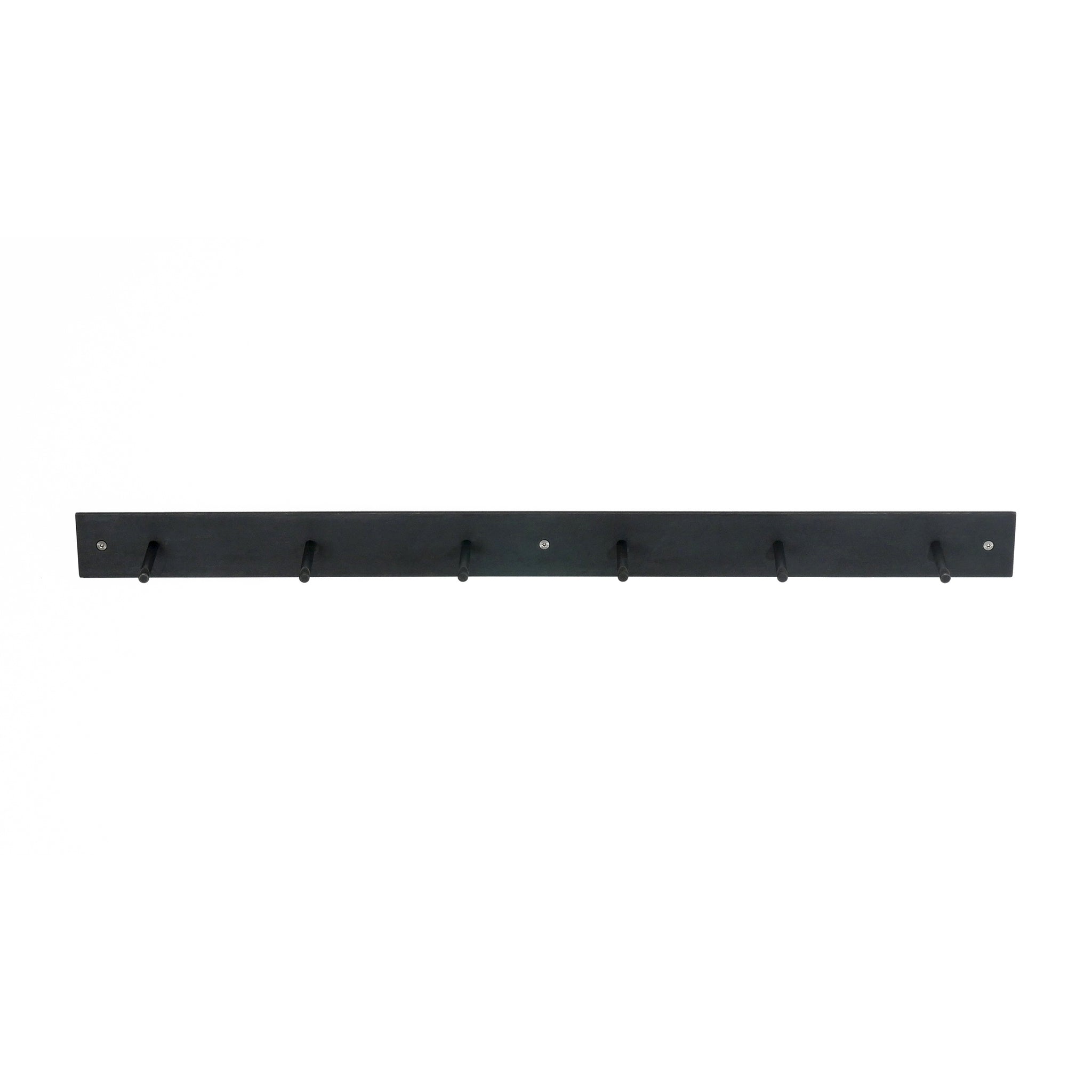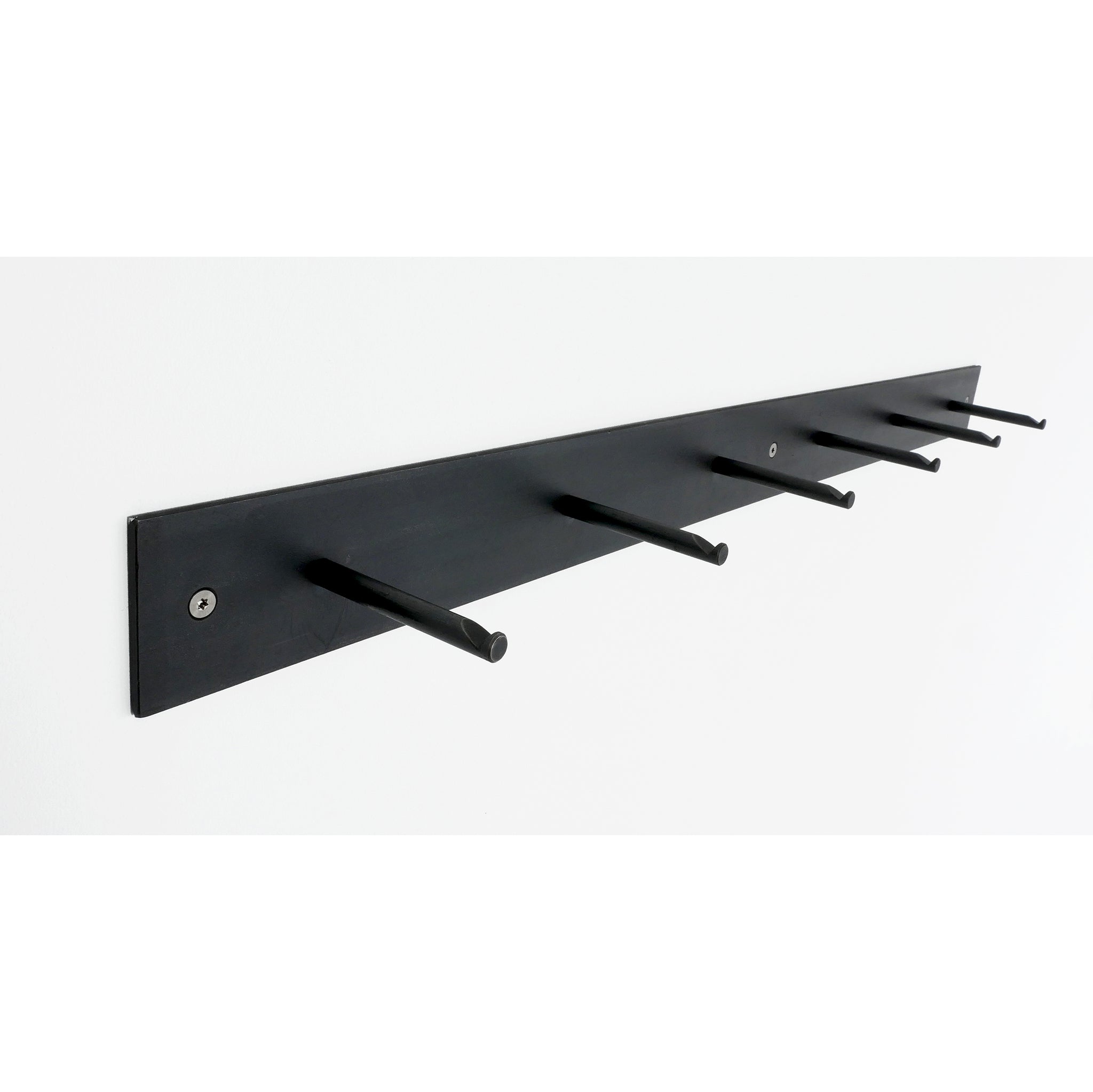 The HELLOGOODBYE by Atelier Haussmann is a black wall-mounted coat rack, featuring five evenly spaced horizontal hooks on a flat rectangular base. Its secured with visible screws, shown from a side angle against a white background for an elegant contrast.
