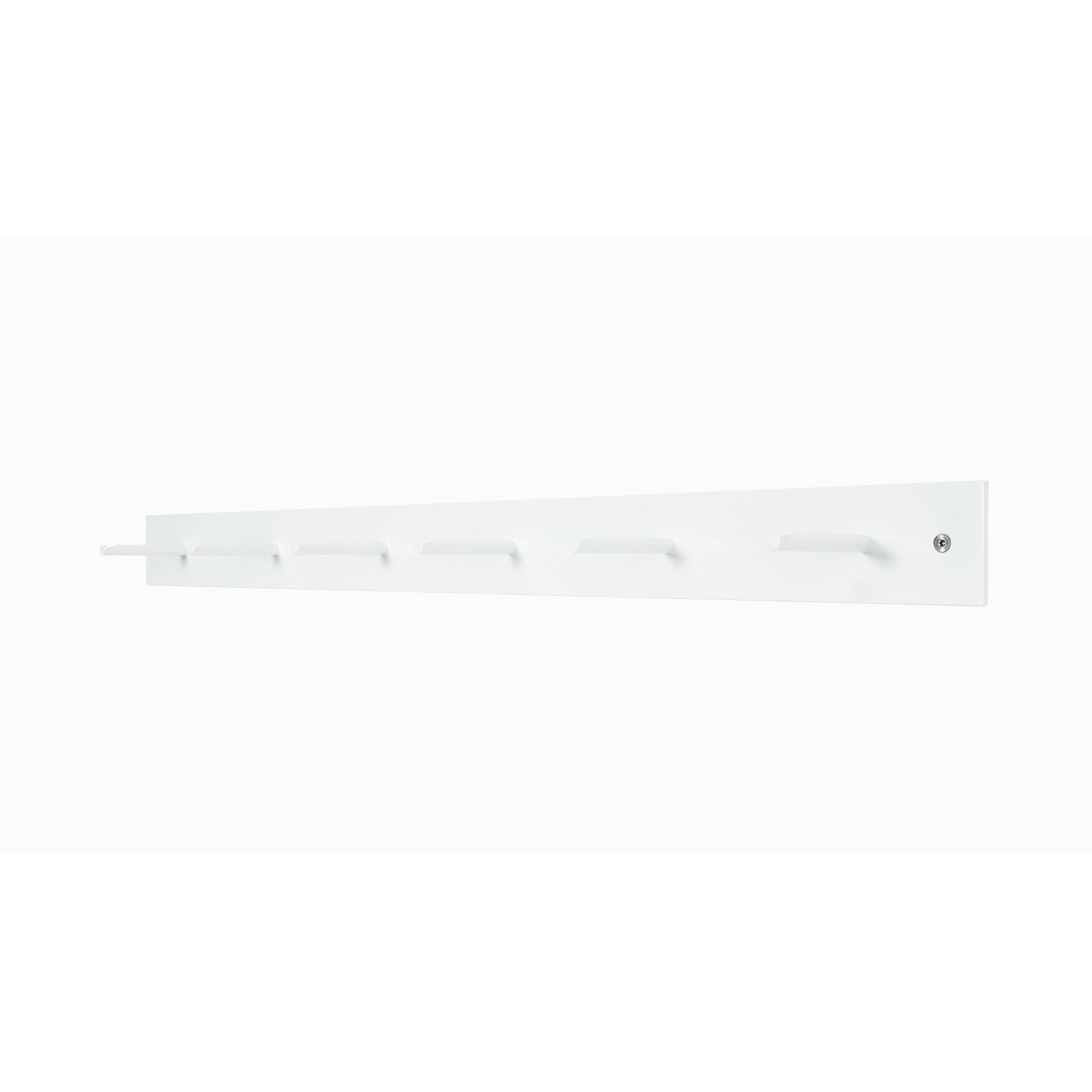 Presenting the HELLOGOODBYE coatrack by Atelier Haussmann: a wall-mounted, white powder-coated steel coat rack featuring five evenly spaced pegs against a sleek white backdrop.