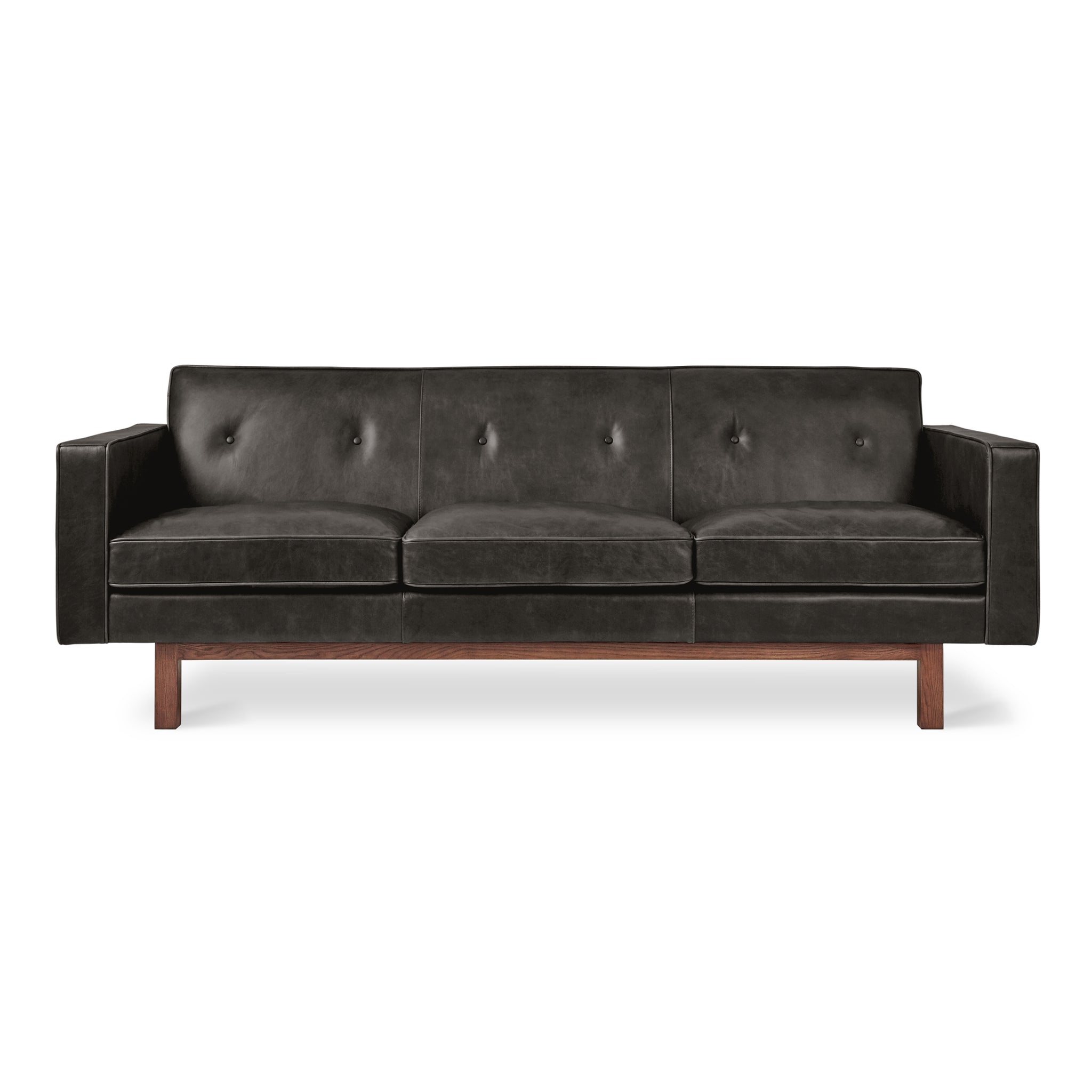 The Embassy Sofa conveys a classic, mid-century style with tailored proportions and refined details. It features a button-tufted, tight back design with piping details throughout, and seat cushions filled with a luxurious feather blend. The frame is supported by a recessed, solid-wood base.