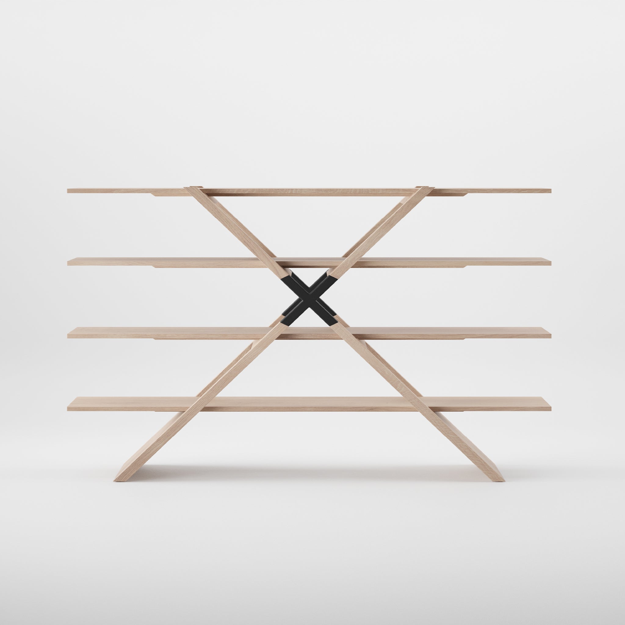 The Artisan X Shelf is a modern wooden bookshelf, crafted from solid wood in a unique crisscross pattern with four shelves. Its minimalist, geometric design is enhanced by eco-friendly materials and natural oils against a white background.