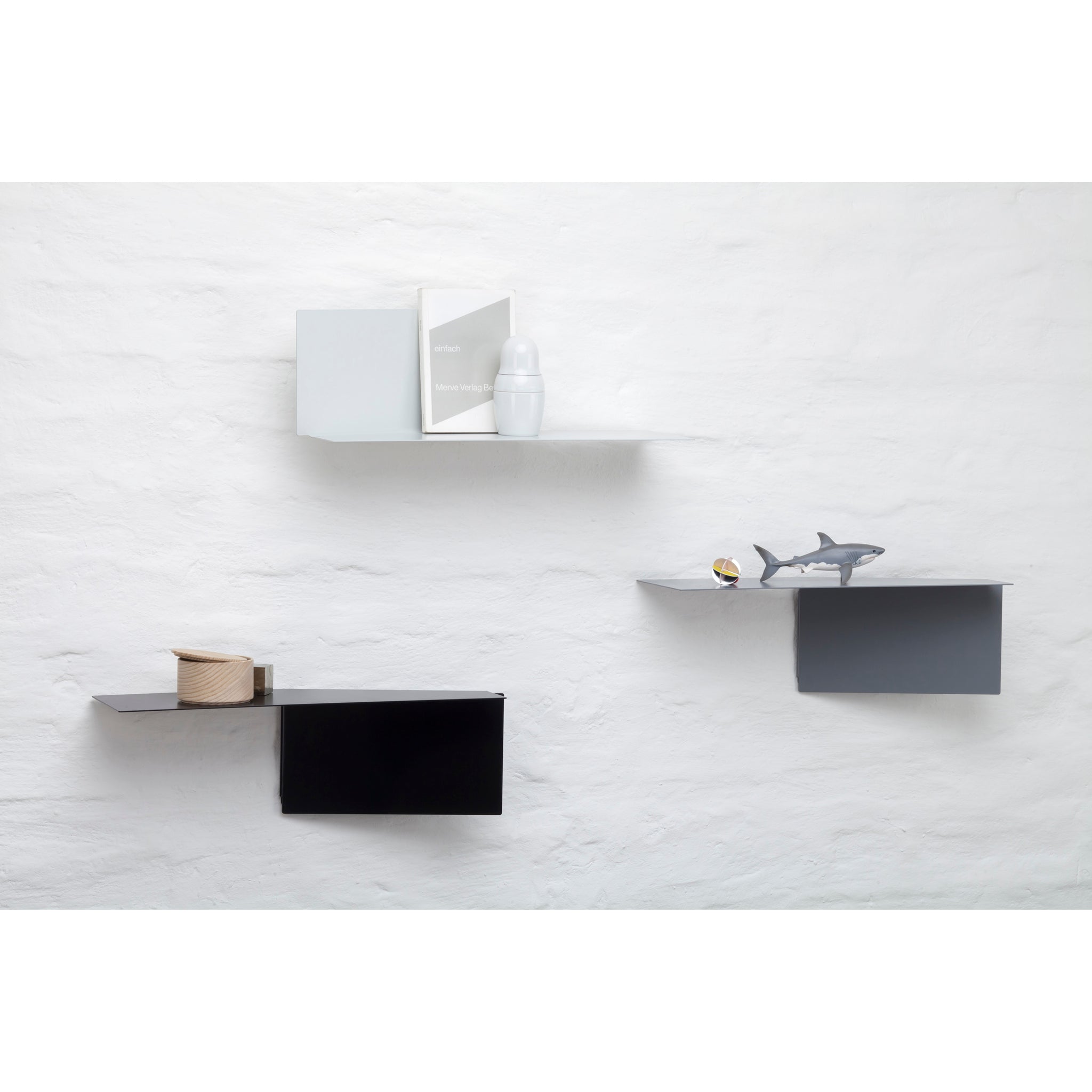 The Plateau rectangular by Echtstahl is a minimalist, wall-mounted shelf made from sleek, powder-coated steel. It features a right-angled design with a vertical back panel and horizontal platform, offering sophisticated shelving with a modern look suitable for various interiors.