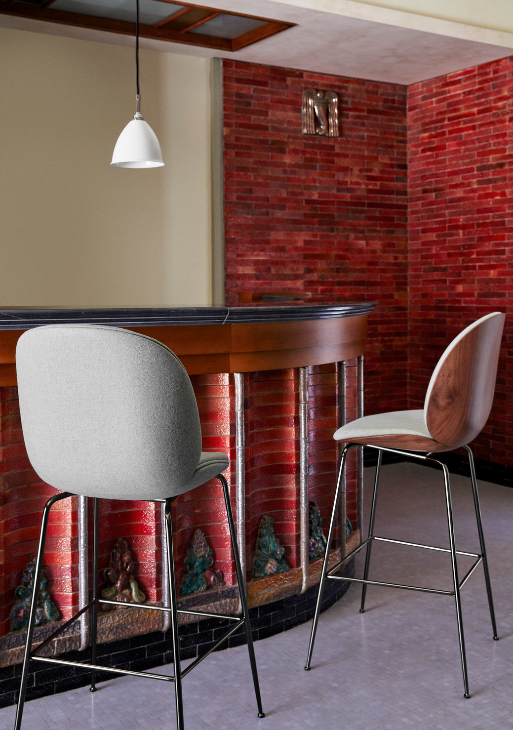 The Beetle Bar Chair has since its introduction in 2013 is well received by end-consumers as well as interior architects. Due to its appealing design, outstanding comfort and unique customisation possibilities, the bar chair can be seen in many of the most renown restaurants around the world. The fully upholstered bar chair carries strong references to the design duo GamFratesi's inspirational source; the insect world, more specific the world of beetles.