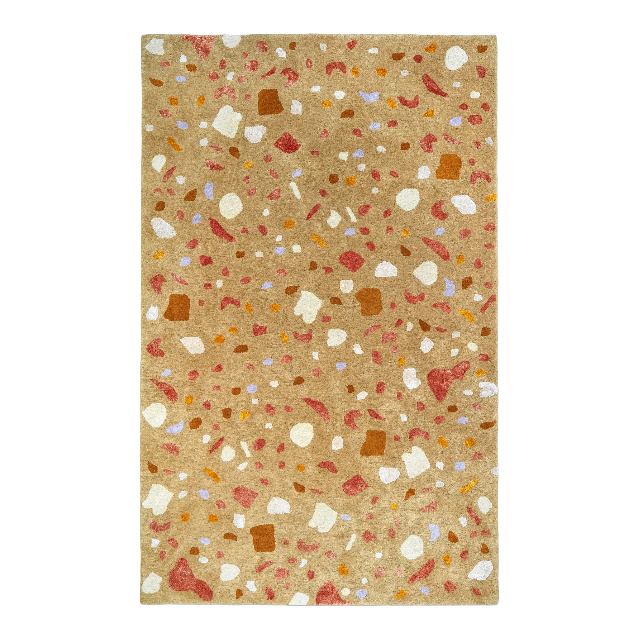 Tan rectangular rug with scattered abstract spots in white, rust, orange, and light purple tones
