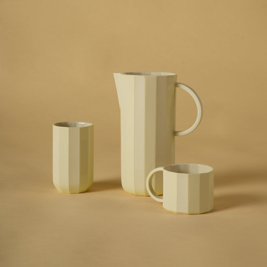The Facet Tableware set is a creation born from a thoughtful exploration of color dynamics and material aesthetics. With its distinctive striped pattern and intentional design, this collection enhances the interplay of edges and surfaces, creating a captivating visual experience. Whether you choose bold poppy red, serene lavender, fresh lemon, or classic cotton white, each piece transforms your dining space into an artful experience.