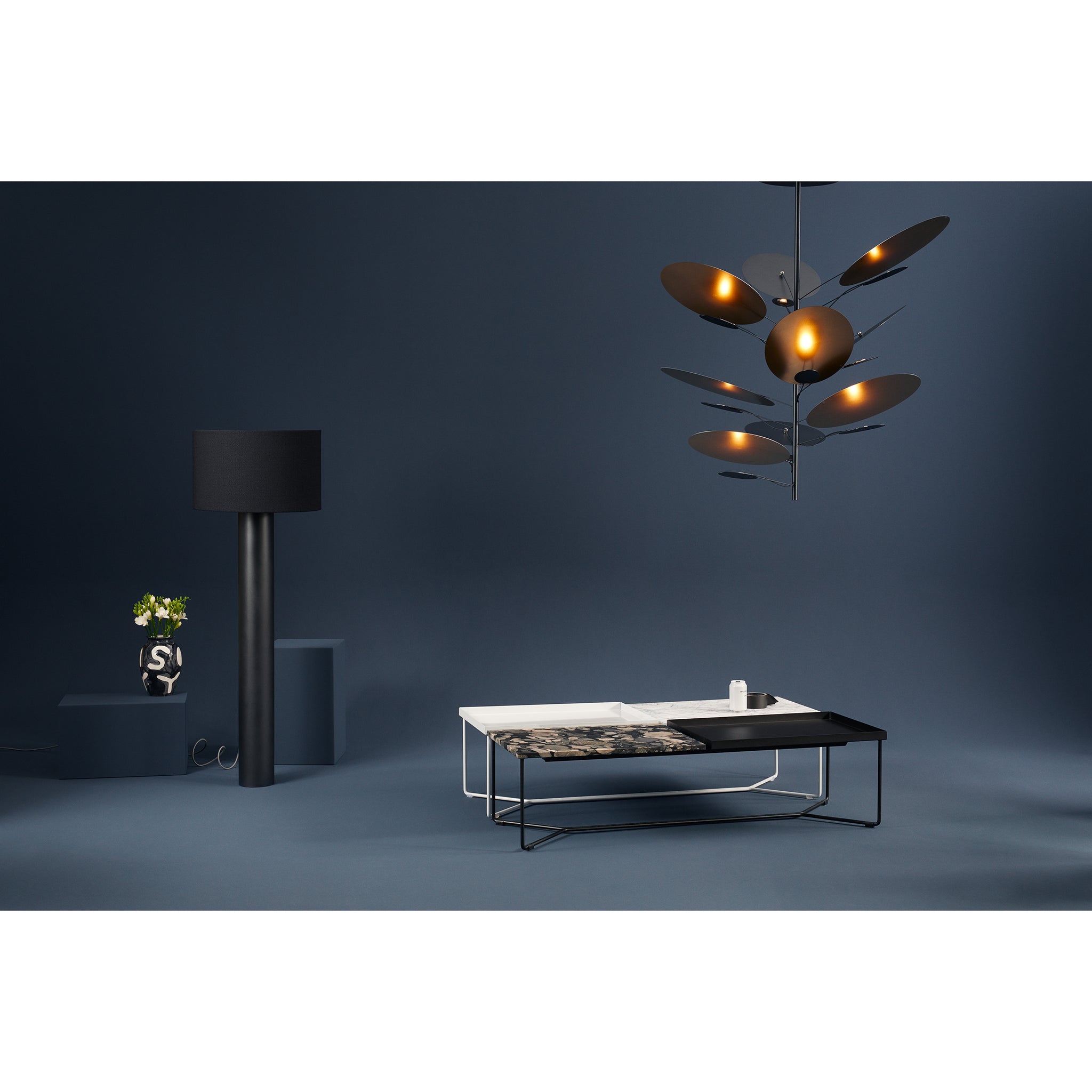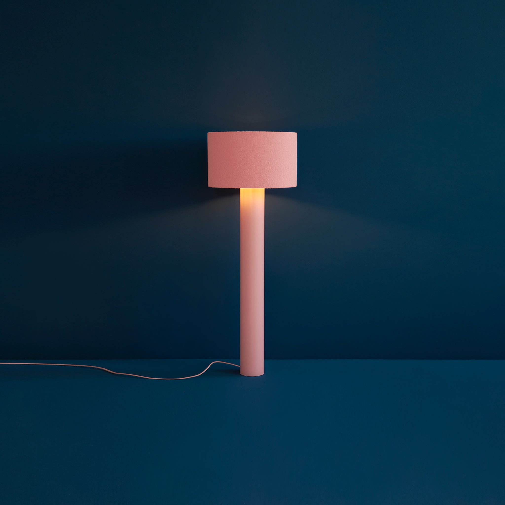The floor lamp has a natural language of form and comes in bright colors. Lampstand and shade are monochrome, but the materials contrast each other. The lampshade is covered with wool fabric and golden on the inside. Therefore, the lamp emits a pleasant warm light.