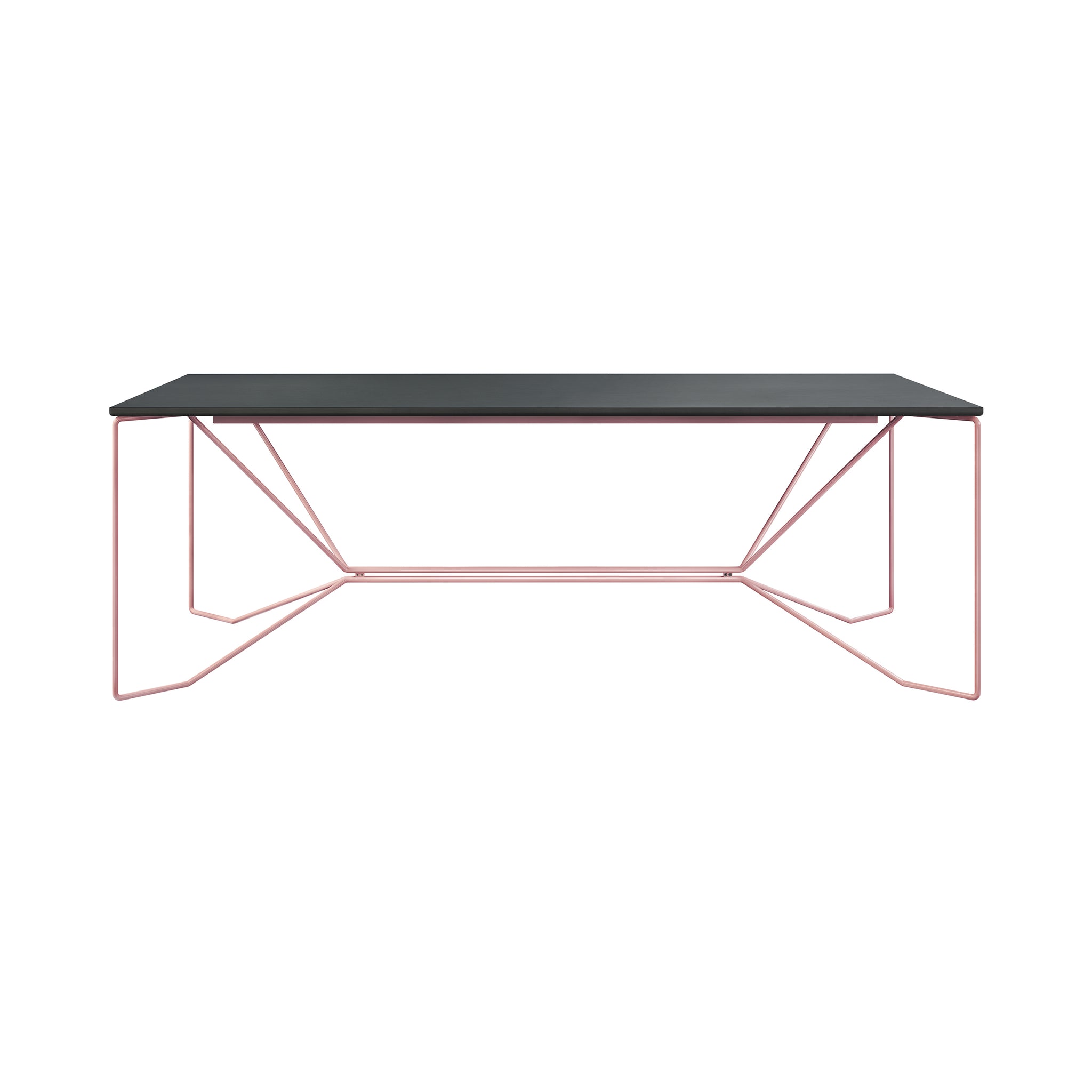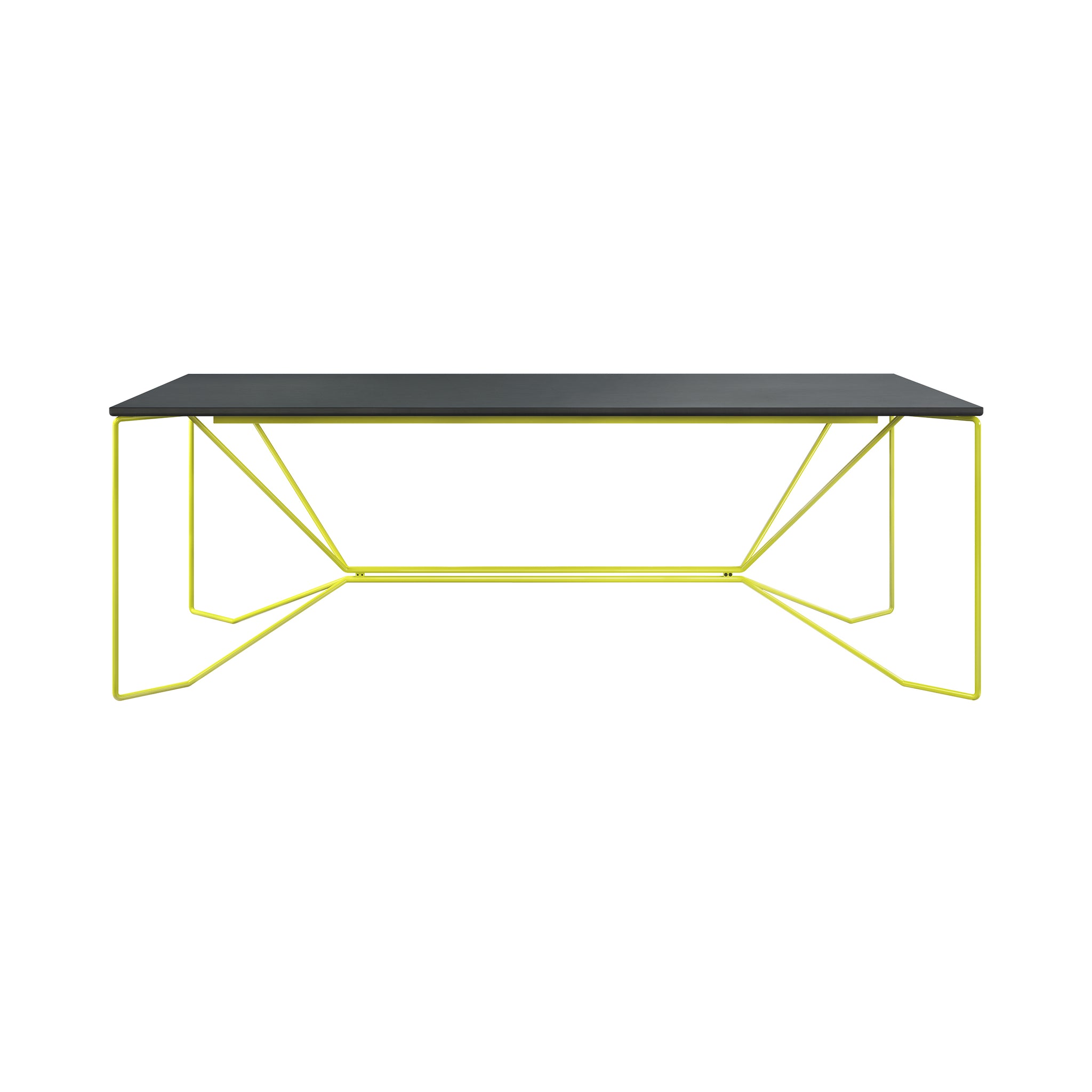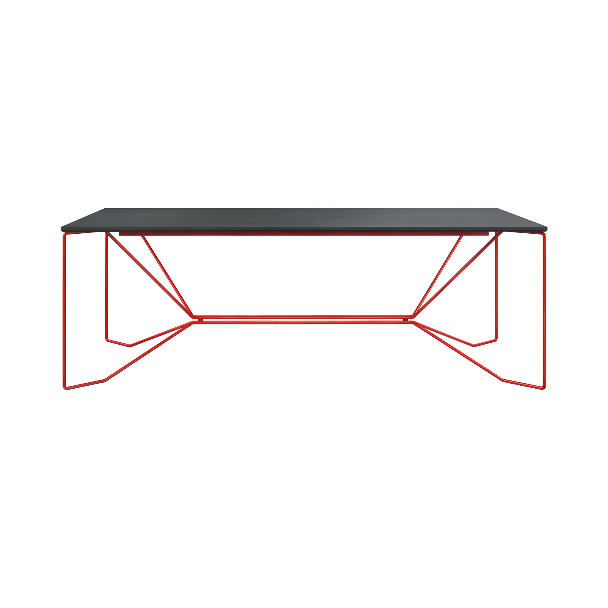 Same same but different. Solid as a rock. Dining table and desk. The delicate steel frame is bent by hand. It consists of two identical parts that reflect each other and are only fastened at two points. The steel tube is powder-coated. The tabletop is supported by a steel frame. Particular about the design and construction is that it looks very light but is extremely solid.