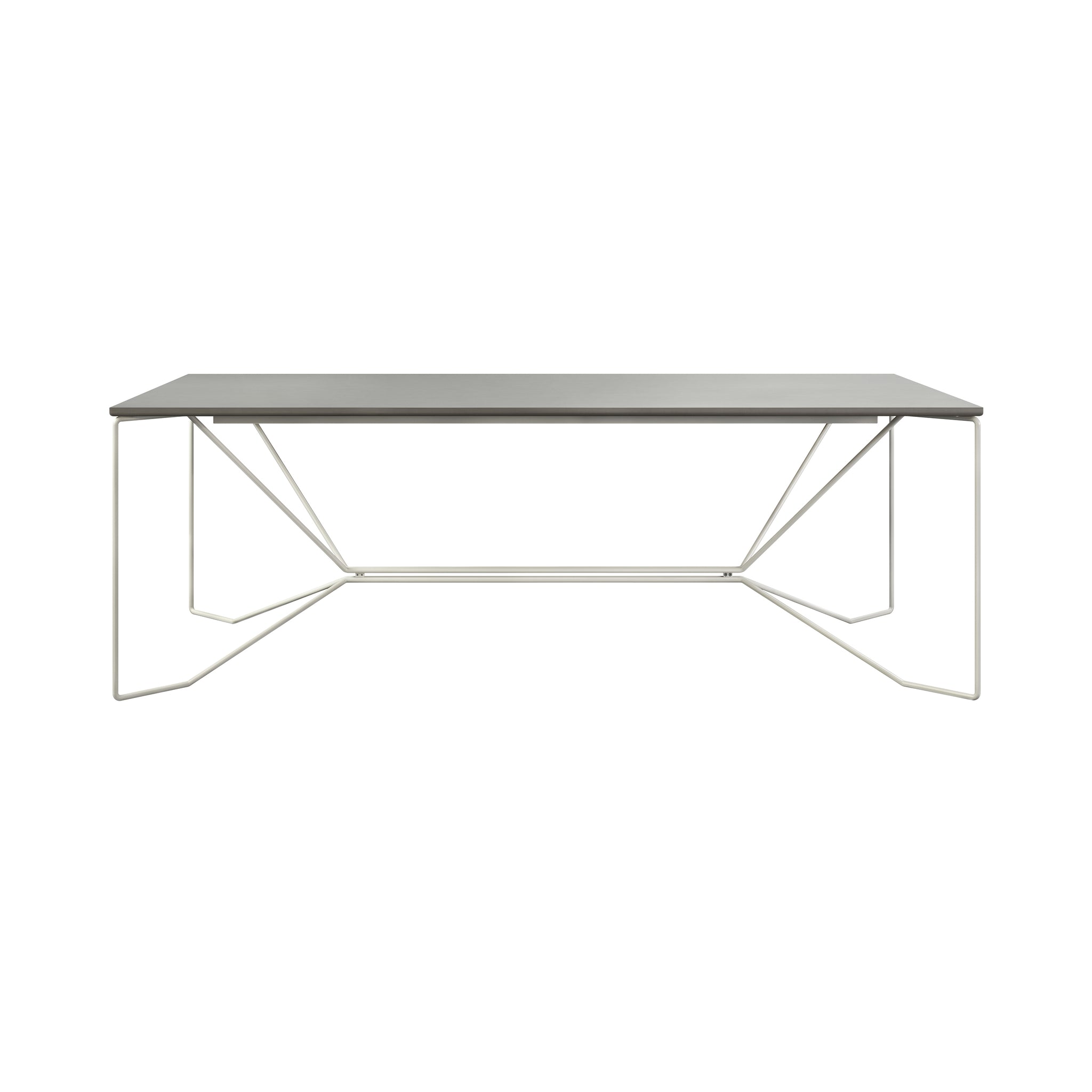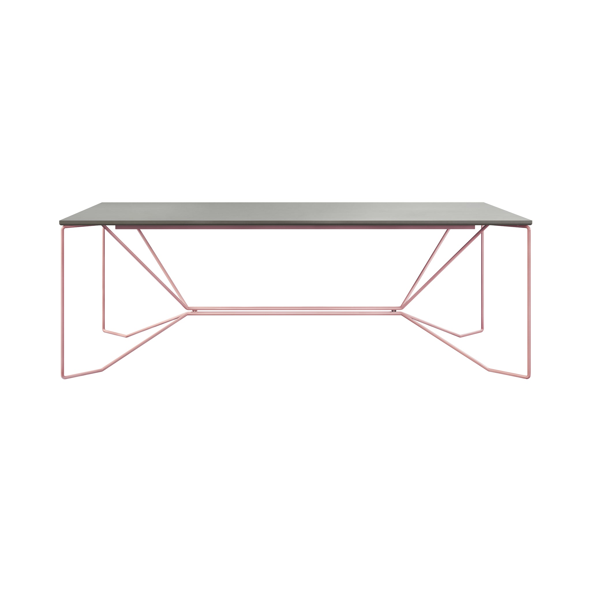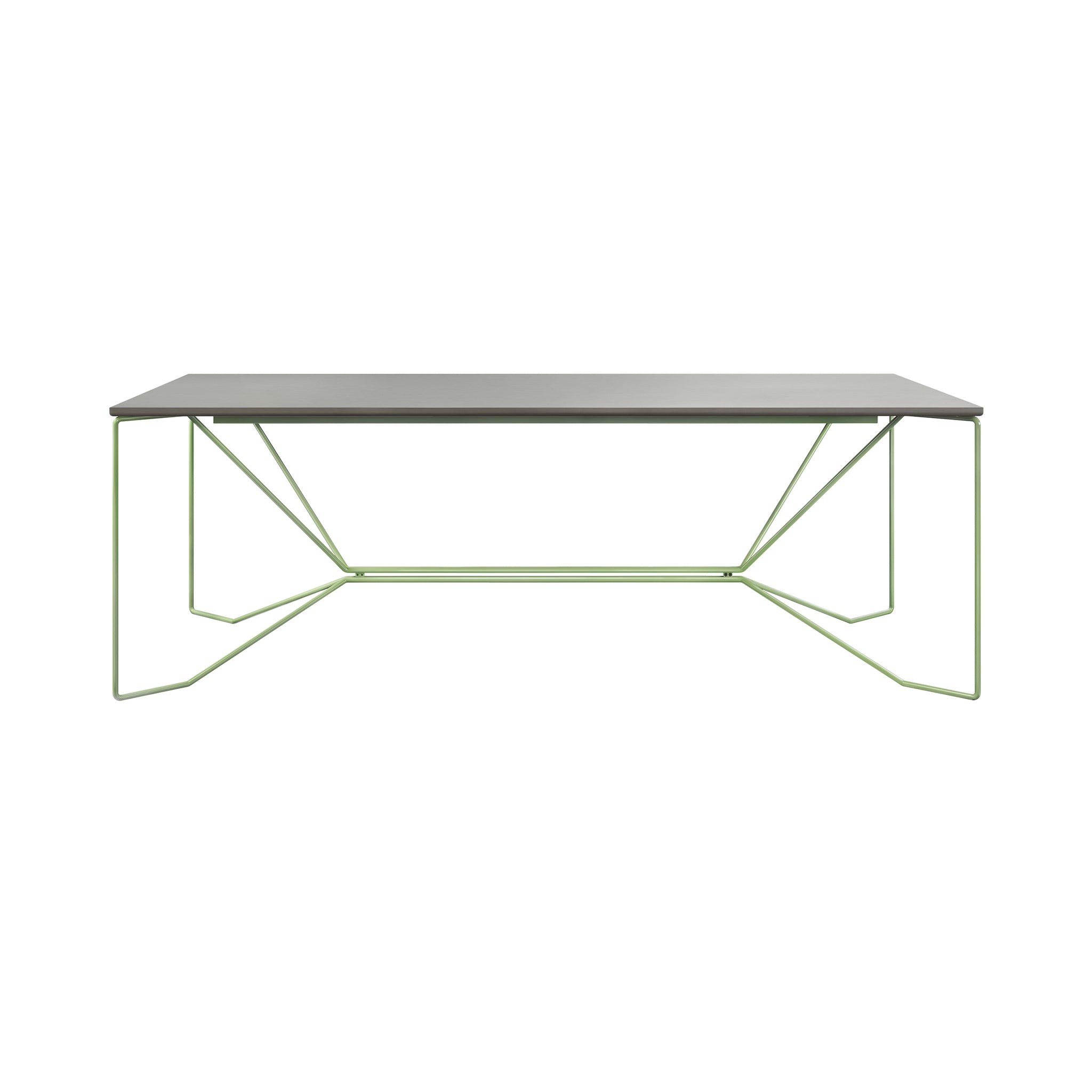 Same same but different. Solid as a rock. Dining table and desk. The delicate steel frame is bent by hand. It consists of two identical parts that reflect each other and are only fastened at two points. The steel tube is powder-coated. The tabletop is supported by a steel frame. Particular about the design and construction is that it looks very light but is extremely solid.