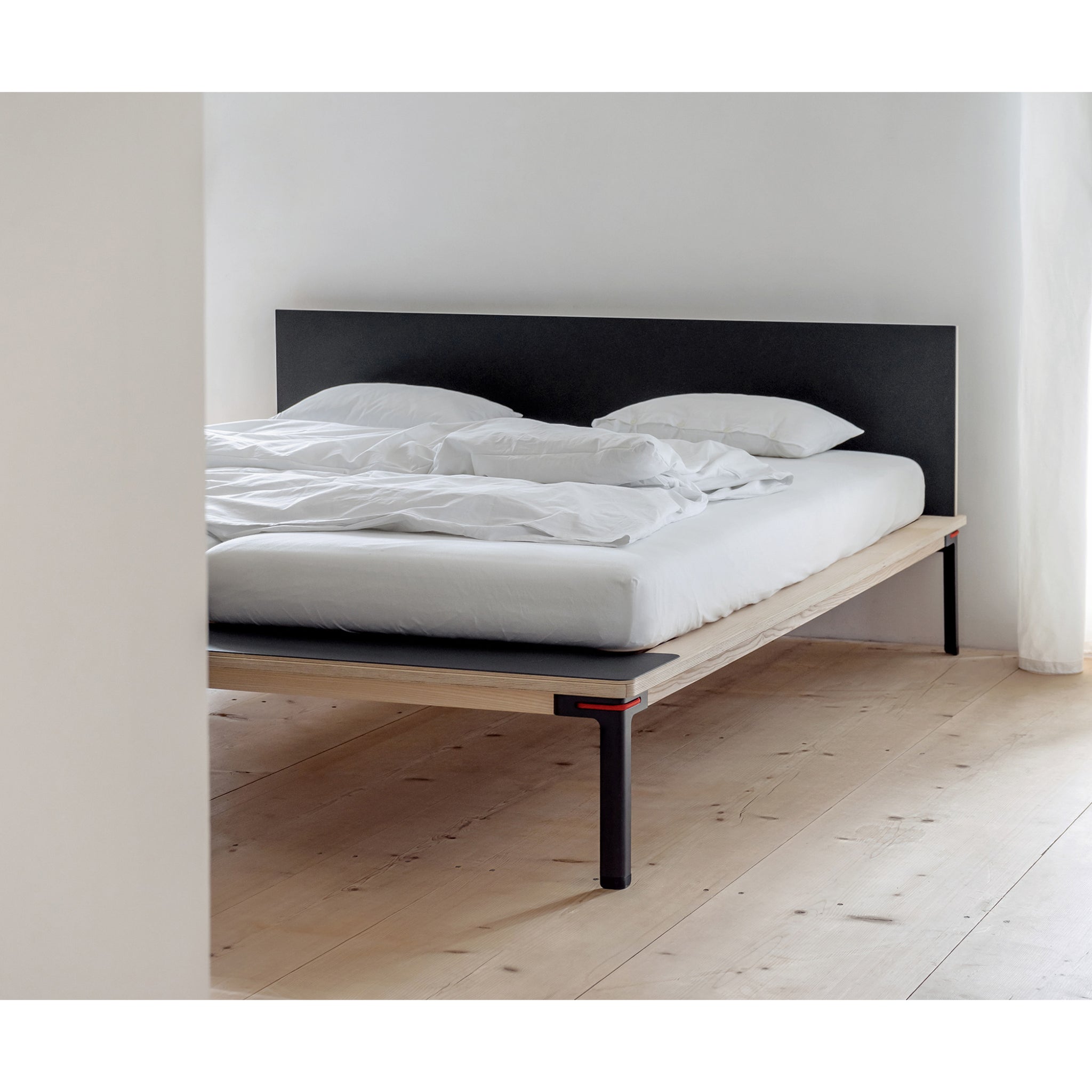 Seiltänzer bed artistically meets this challenge with four filigree steel legs and an almost floating surface area. And in this way withstands any size. Connected and fixed with four taut ropes, in red or black. For alarm clocks, nightly reference books or breakfast on the bed, the frame can be expanded according to your wishes or dreams for storage. Nothing could be simpler.