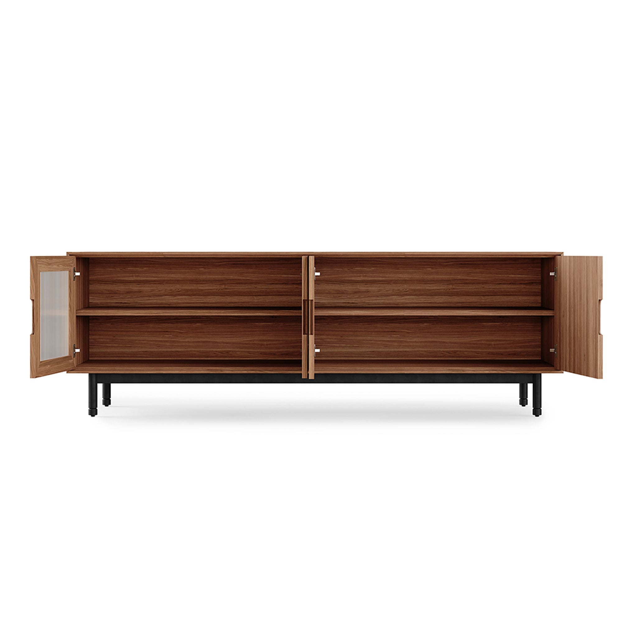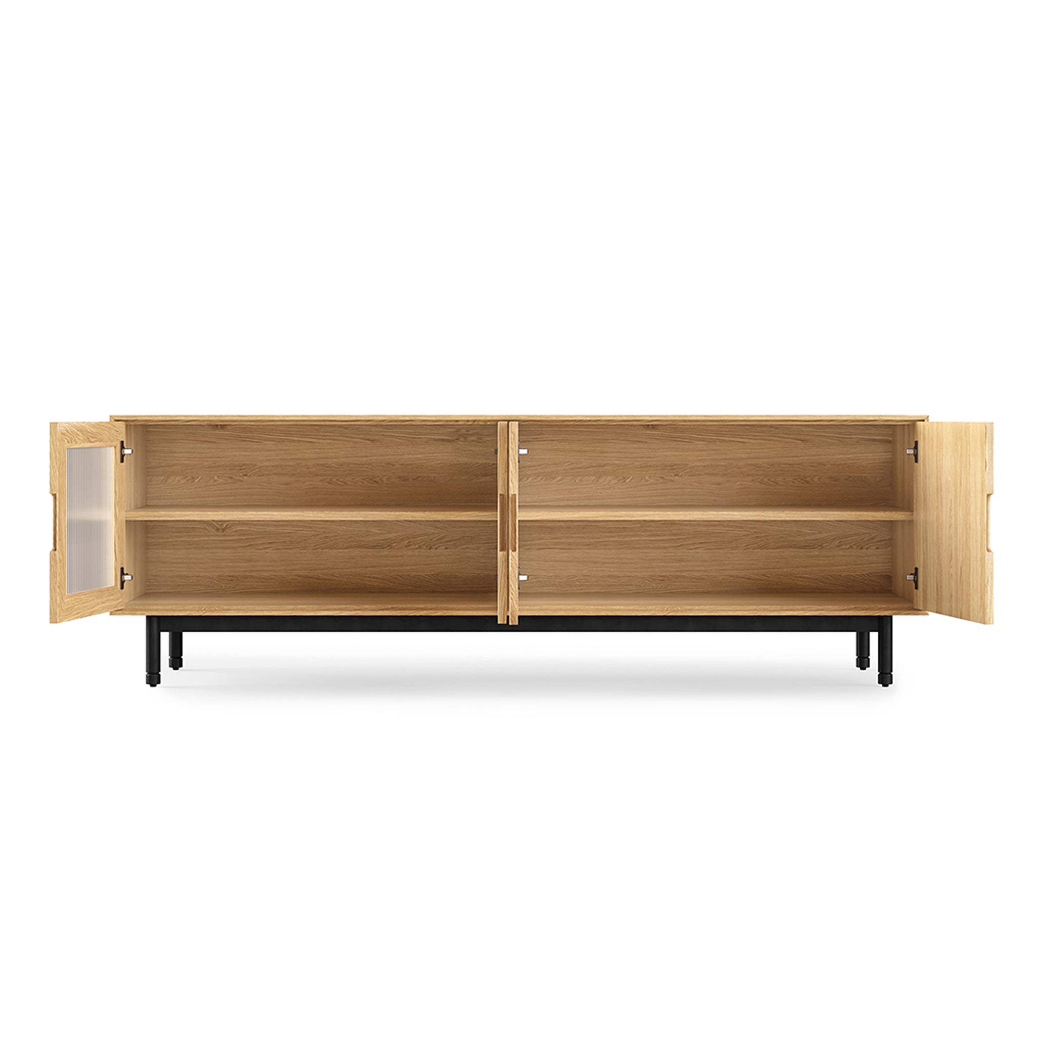 Our bespoke Munro Credenza is the ideal place to keep your favorite treasures safely tucked away. Fluted glass doors allow you to admire what’s within while maintaining an air of mystery and two adjustable interior shelves give you the flexibility to find an arrangement that works for you. Considered design elements like soft-close doors, magnetic closures, and recessed handles prove no detail is too small. The options are truly endless for a piece this versatile - use it to store your heirloom dishware in the dining room, or as a tasteful catch-all to keep things tidy in the living room. Choose from Walnut or Oak, each with a Zero‐VOC, hand‐rubbed matte finish, thoughtfully selected to highlight the unique, organic beauty of the wood grain. Solid wood edge details and solid steel legs mean that this credenza is built to last – a good thing because Munro’s classic, minimalist ethos will never go out of style.