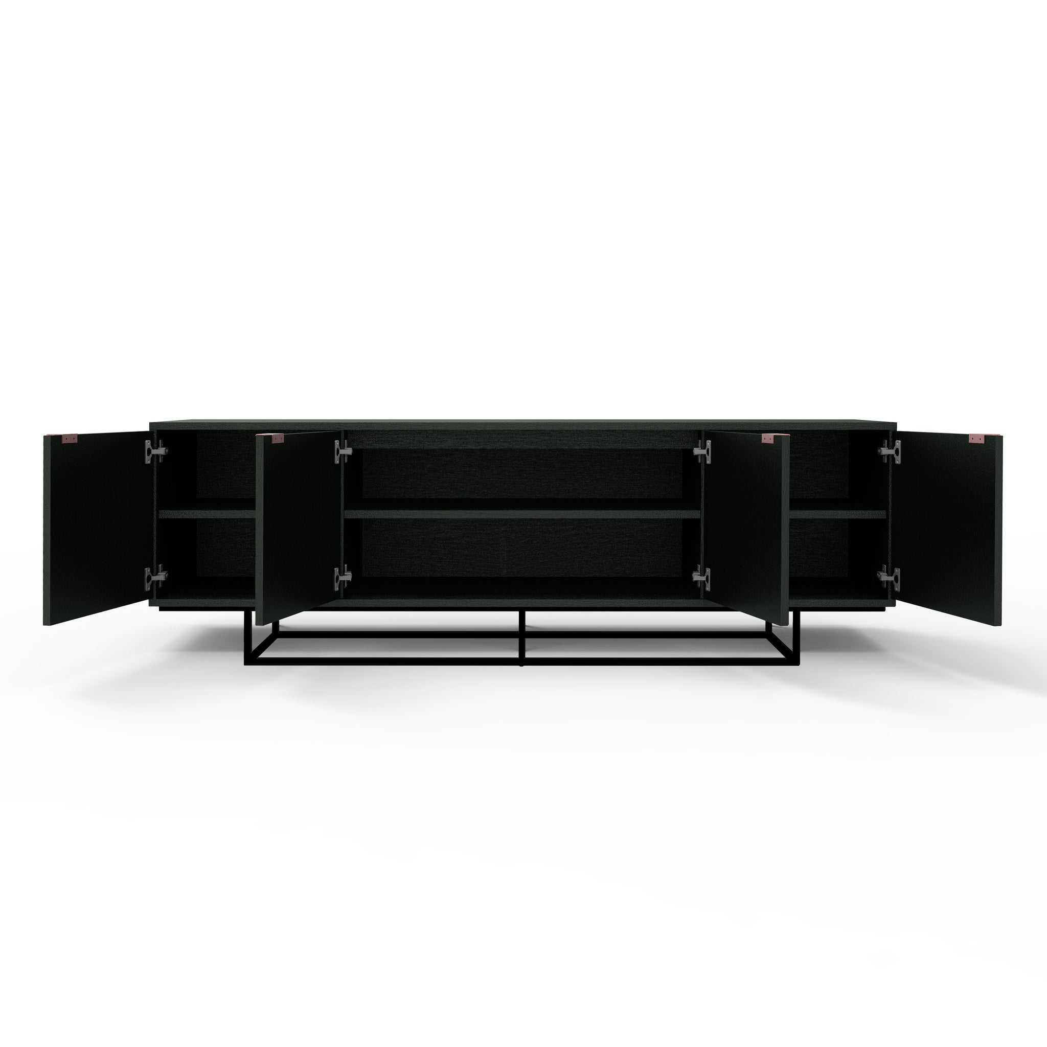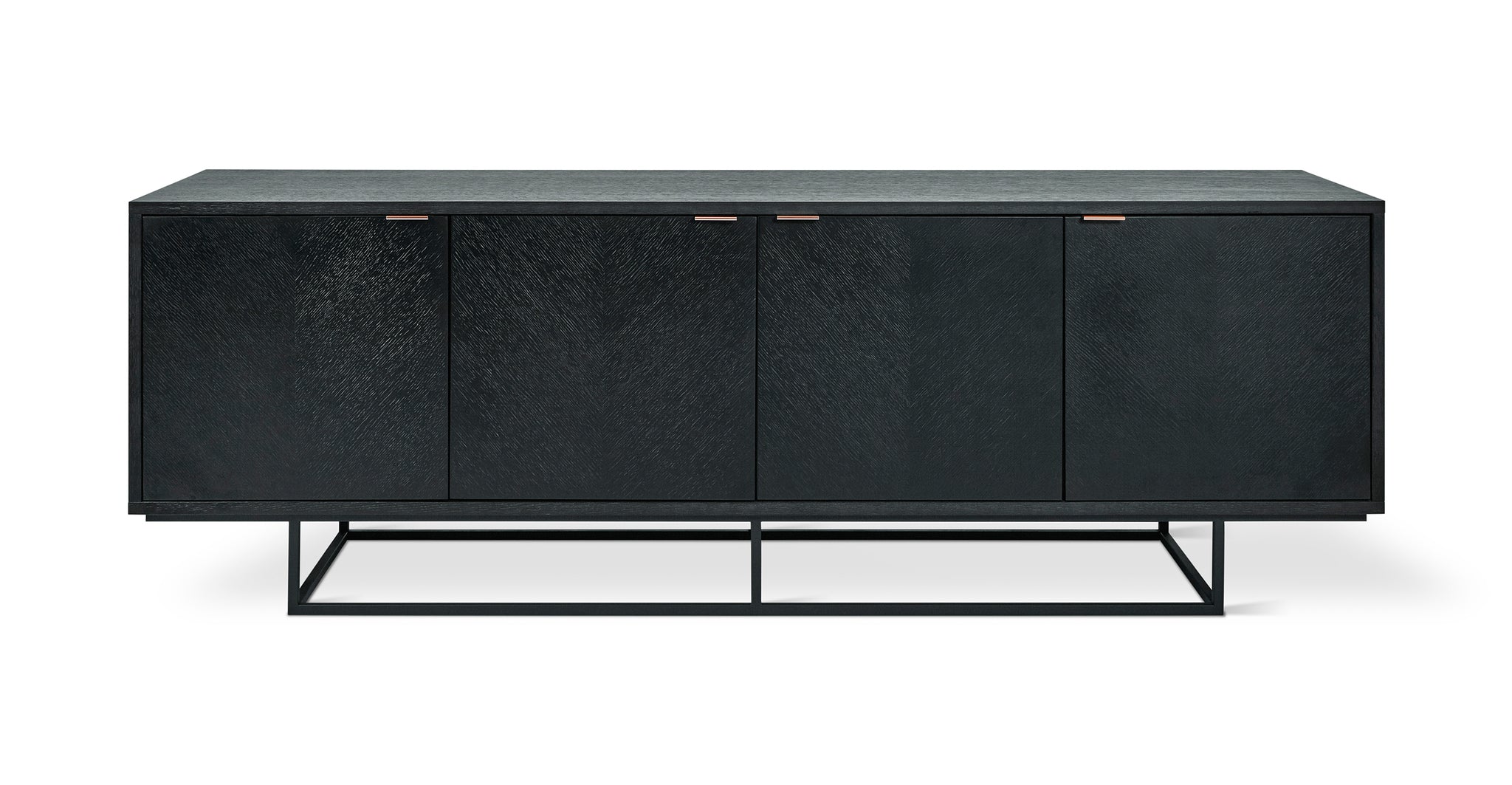 The Myles Credenza combines subtle details and craftsmanship to create a storage design that exudes simple sophistication. Rose gold handles contrast dark stained, chevron-patterned oak faces. A recessed, slender steel base with black, powder-coated finish creates an illusion of weightlessness. Adjustable shelves provide plenty of efficient storage space.