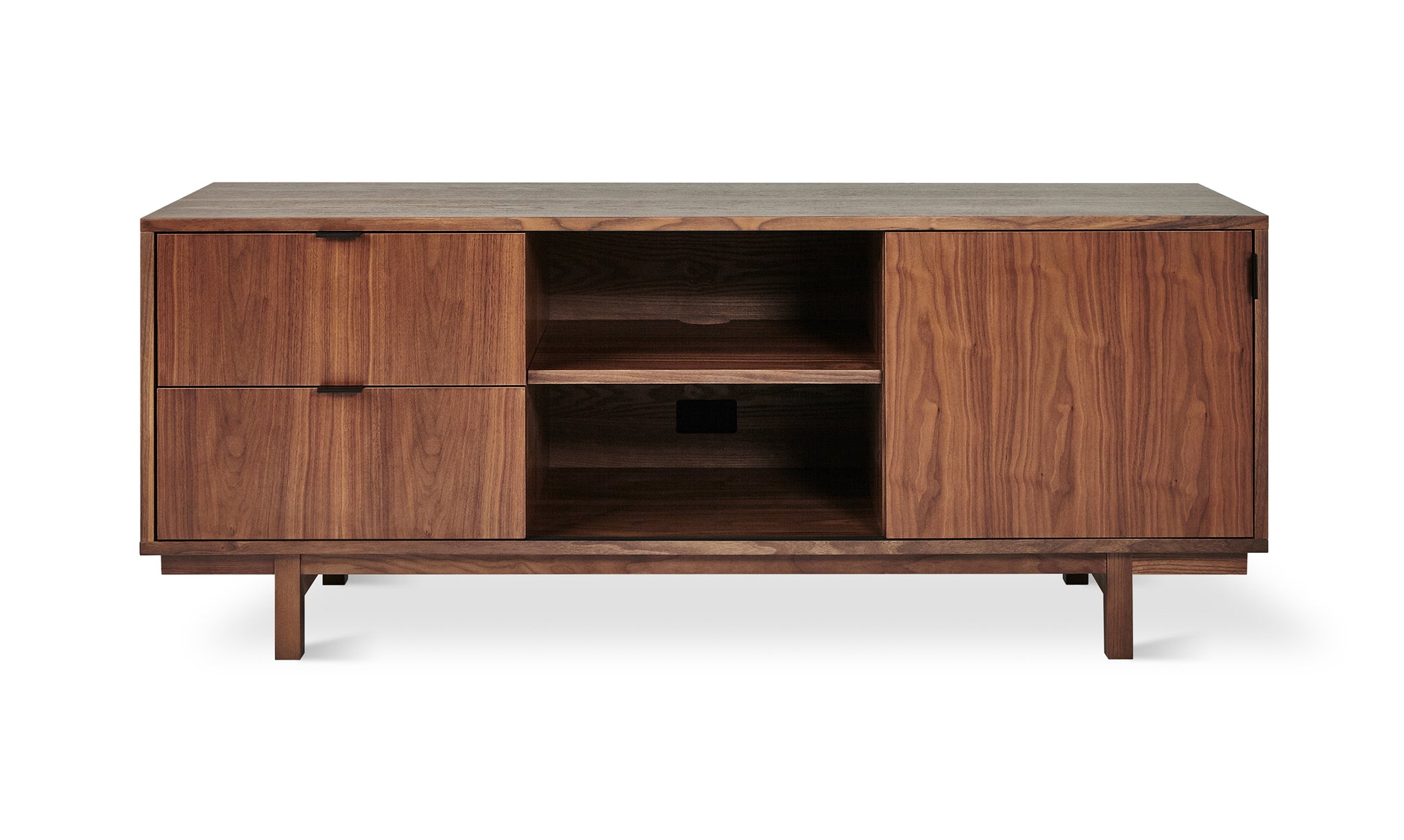 The Belmont Media Stand is an architecturally inspired storage design that features the natural beauty of walnut. Designed for Hi-Fi and media components, a back panel opening in the cabinet allows for concealed cable management. Drawers provide storage to keep your living room uncluttered, while adjustable shelves and a sliding front panel let you reveal or conceal components.