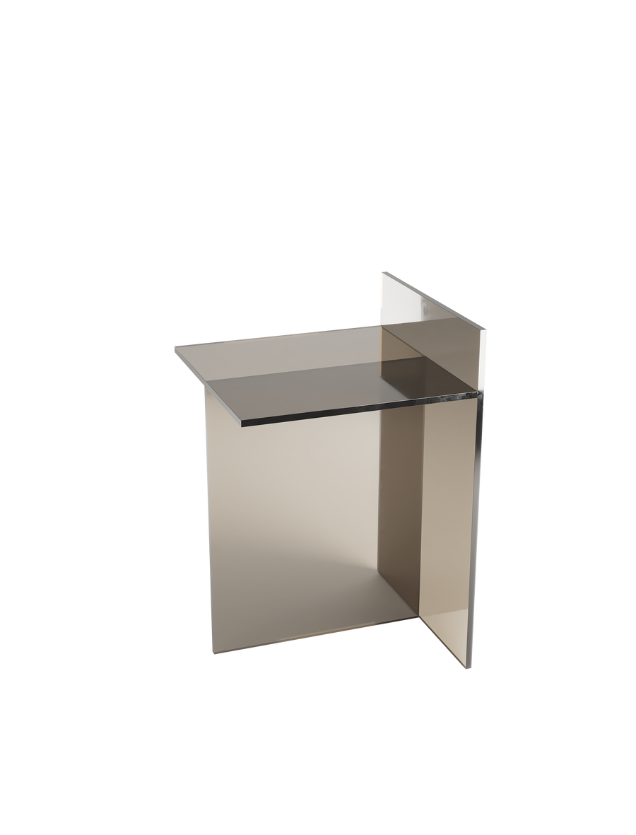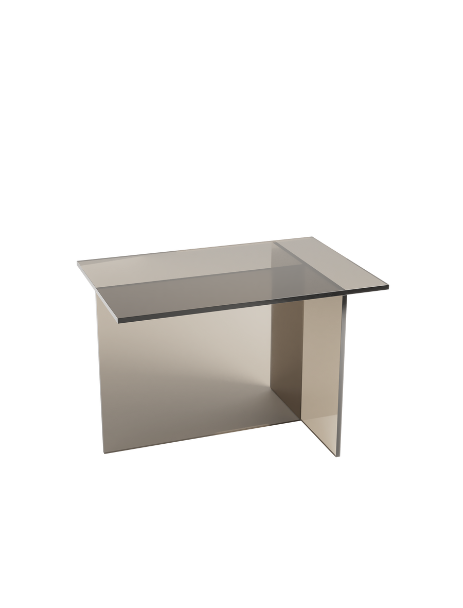 THEO Glass Side Table in smoked glass with intersecting panels forming a T shape, modern and versatile design.
