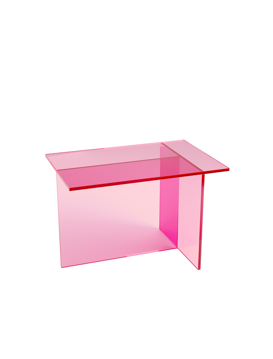 THEO Glass Side Table in ruby red, minimalist glass design forming a T shape, adaptable and functional.