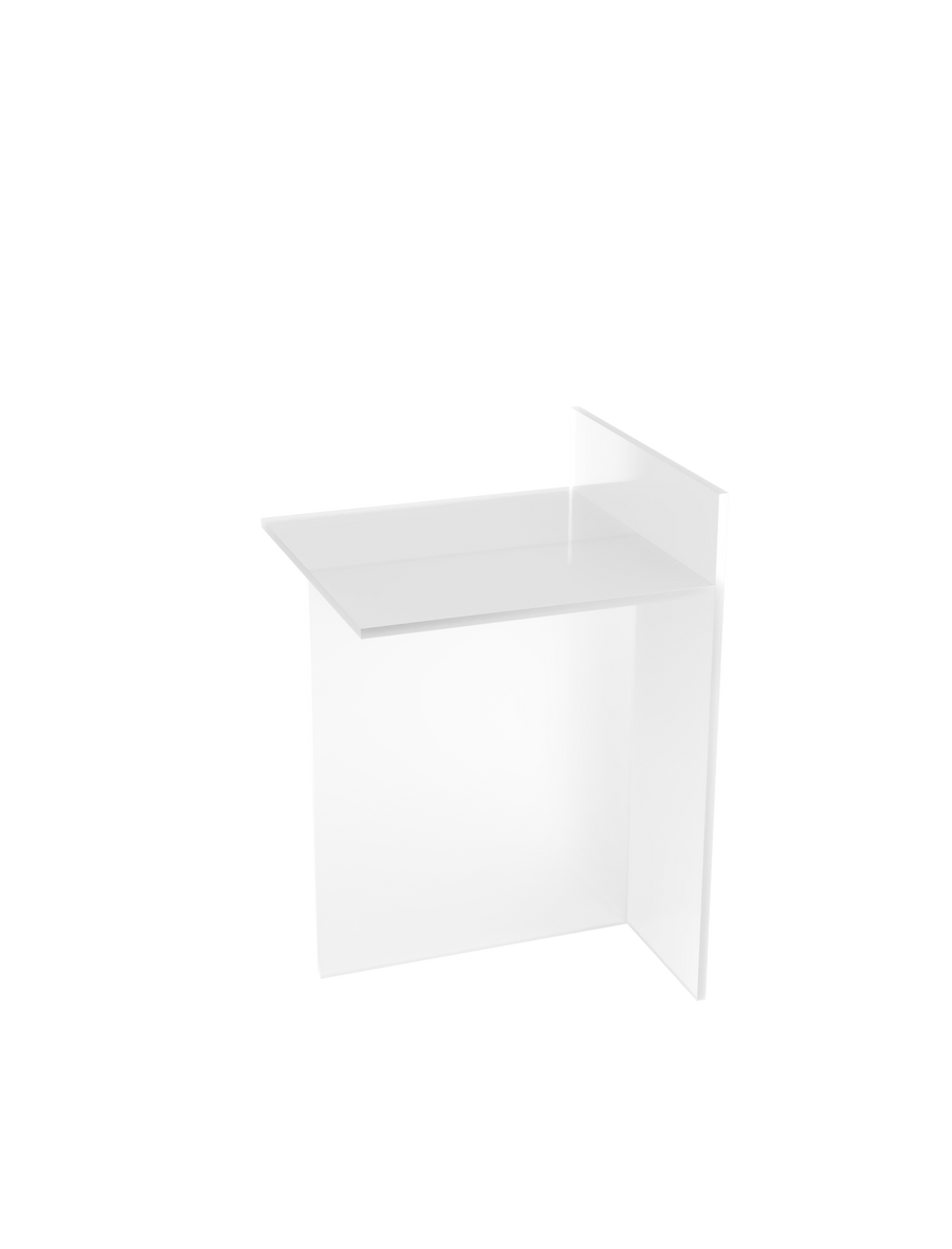 THEO Glass Side Table in artic snow, minimalist glass design with intersecting elements forming a T shape.