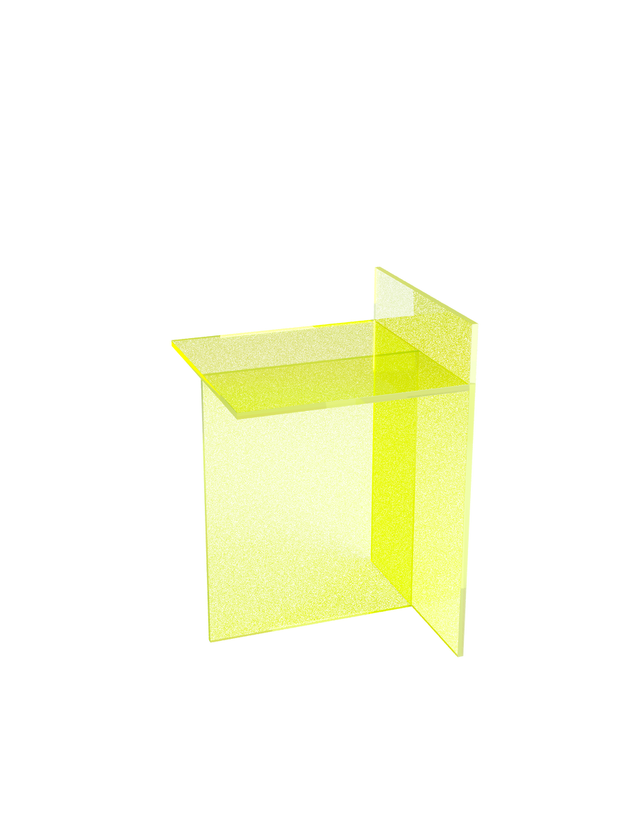 THEO Glass Side Table in translucent yellow with intersecting glass panels forming a modern T shape design.