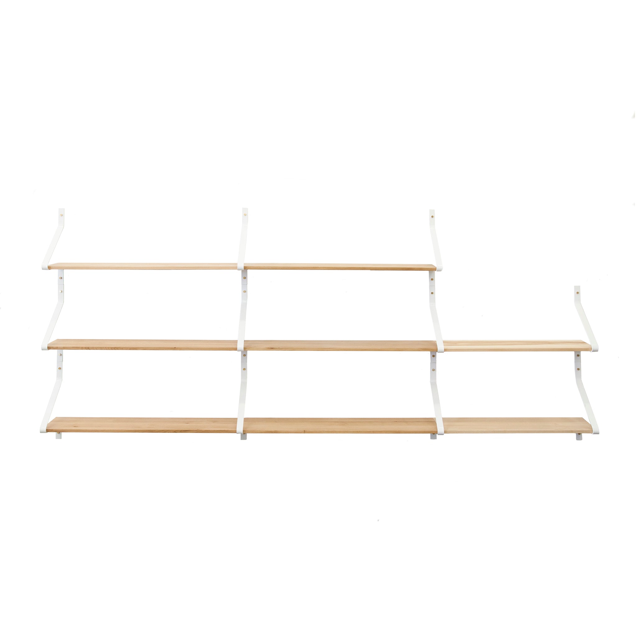 The Ribbon shelving system consists of a curved, powder-coated steel strip and shelves made of oiled solid wood.