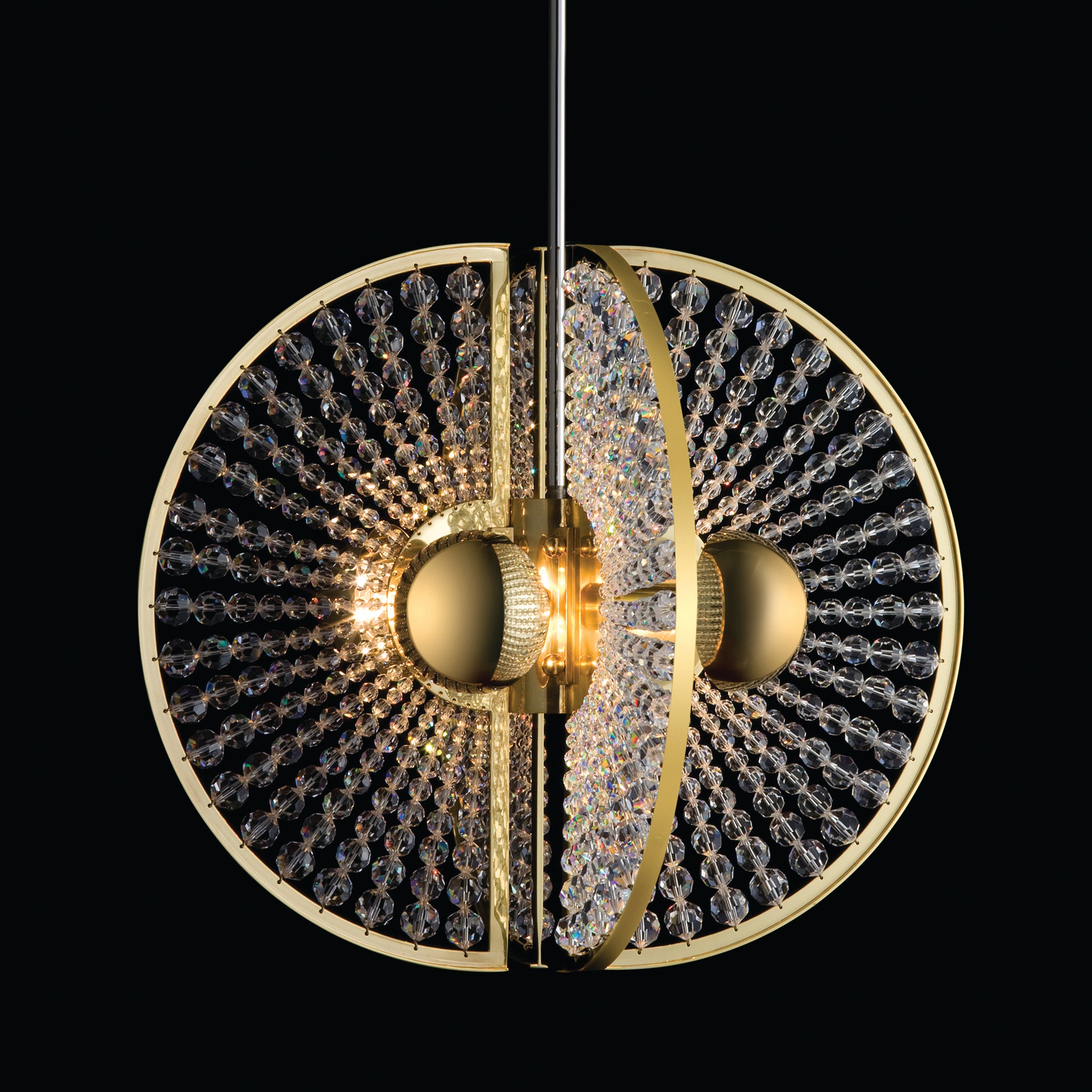 The Lobmeyr Brilliant 6878 by Lobmeyr is a spherical chandelier with a brass frame and Swarovski beads, divided into two halves. Its crystals reflect light from central bulbs, creating a radiant, symmetrical design against a black backdrop.