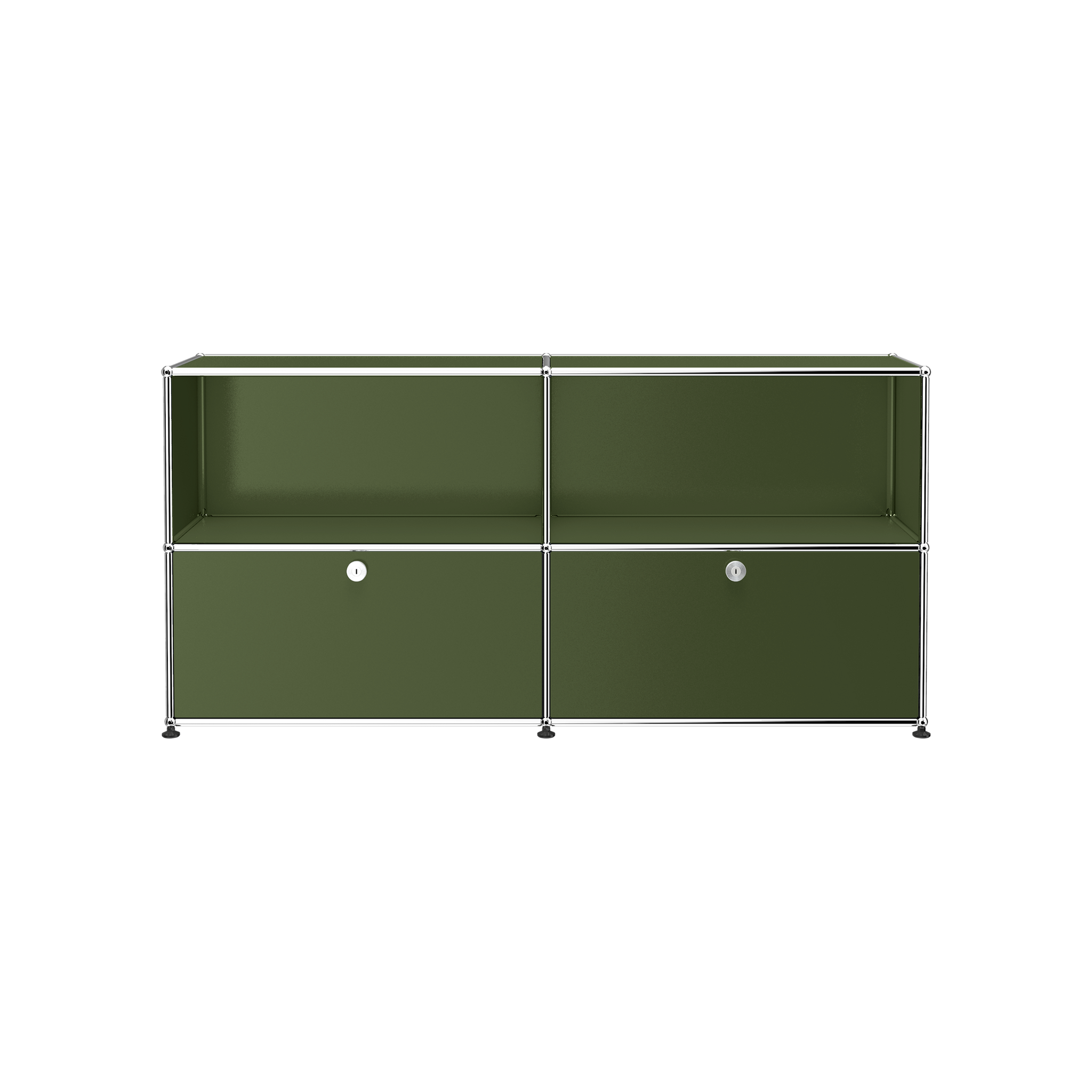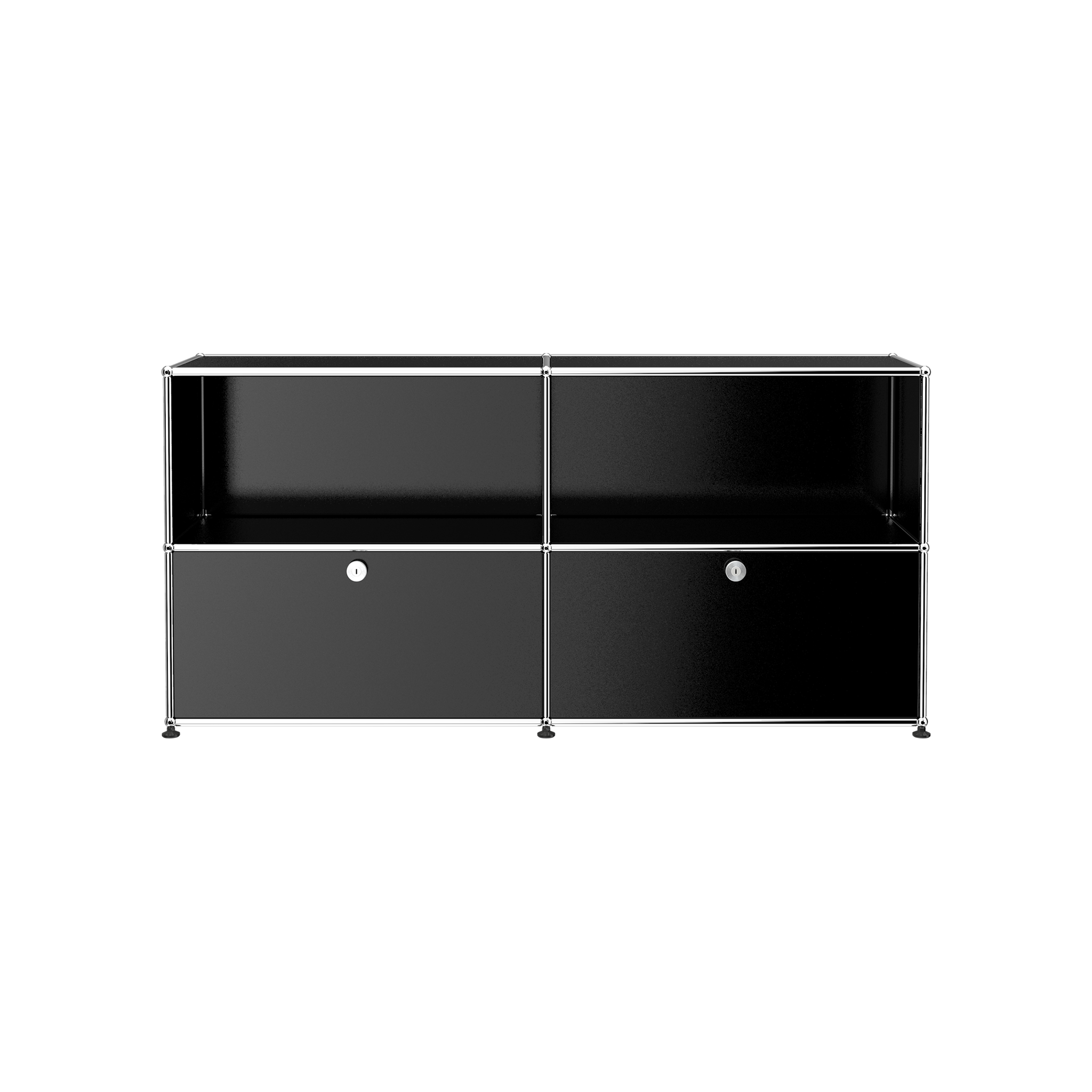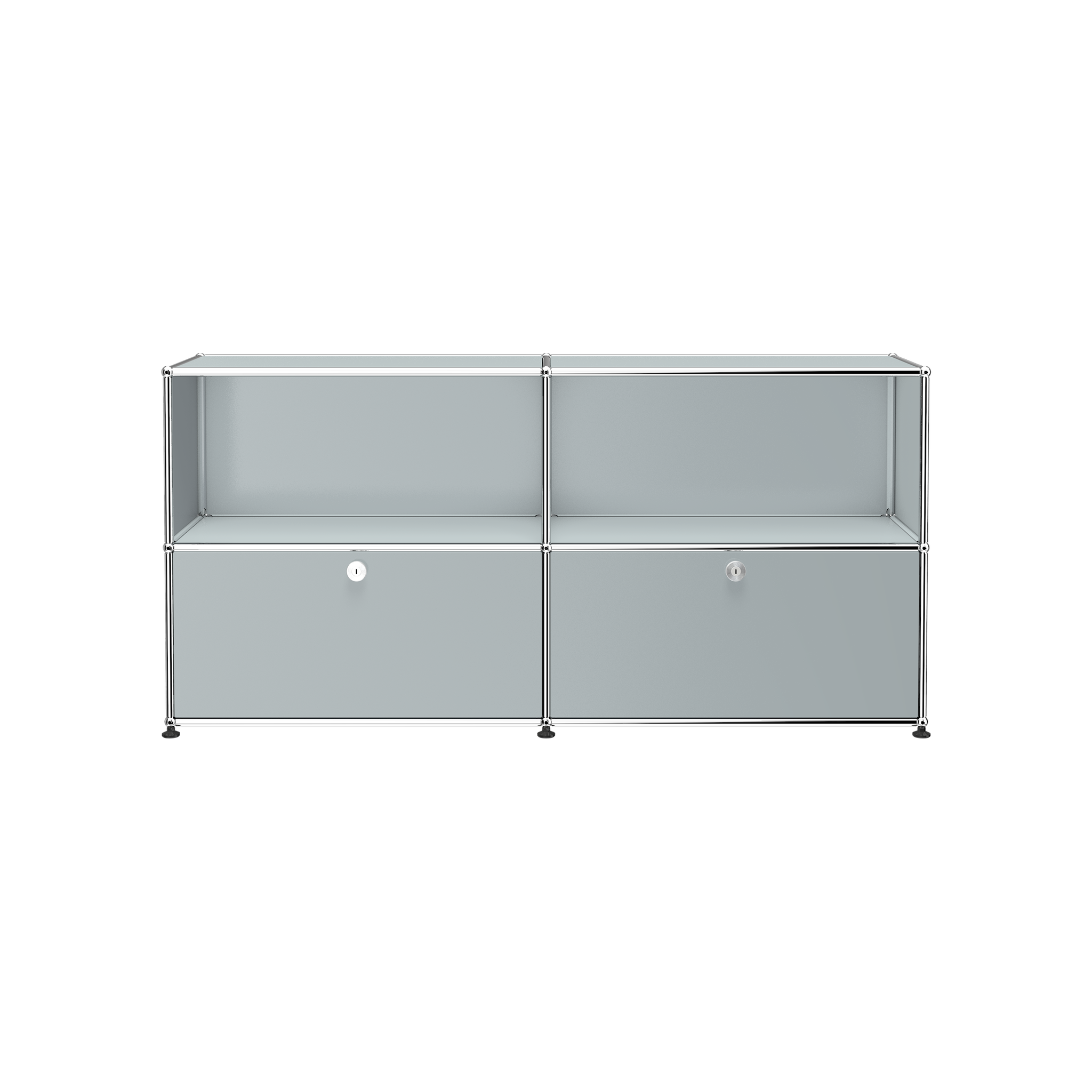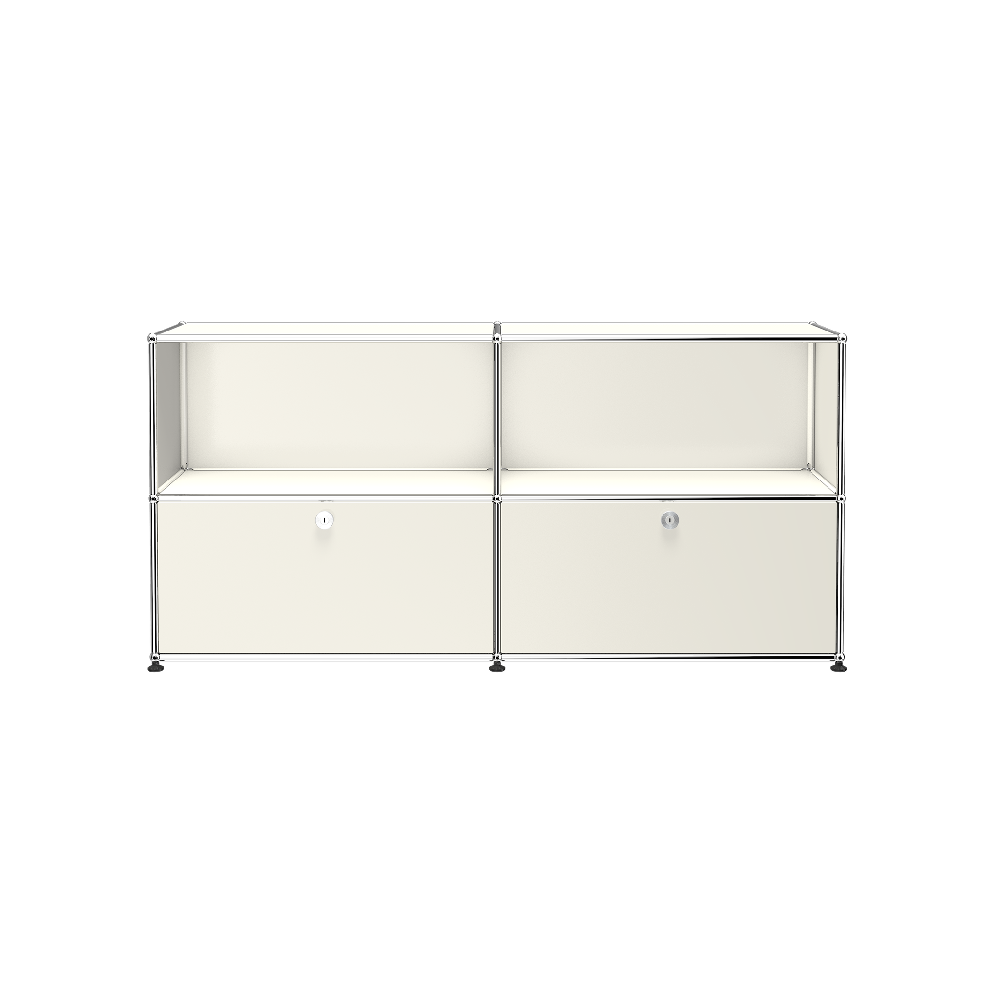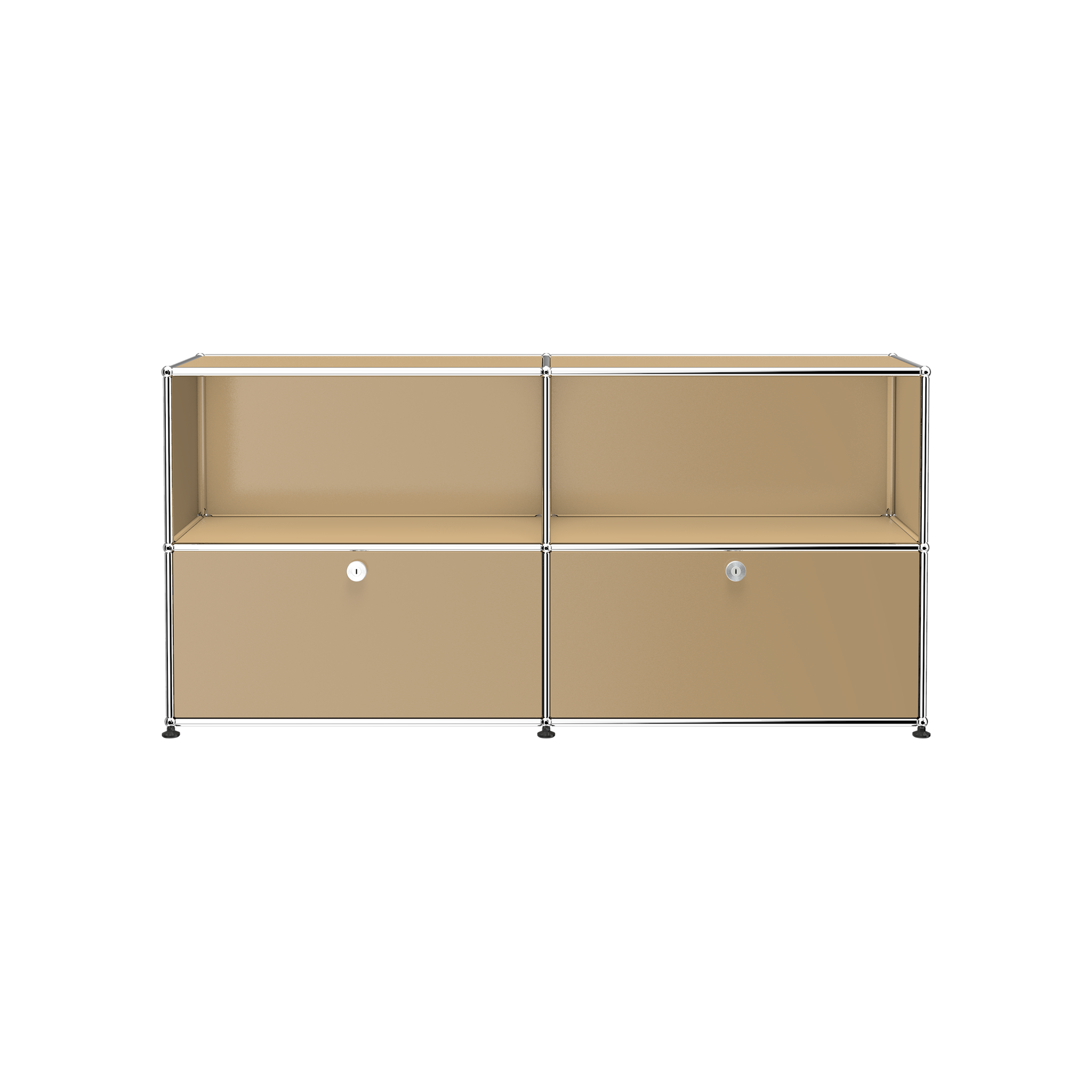 A functional storage credenza with open top sections and two 14"H drop down doors on the bottom that lock with the twist of a coin.