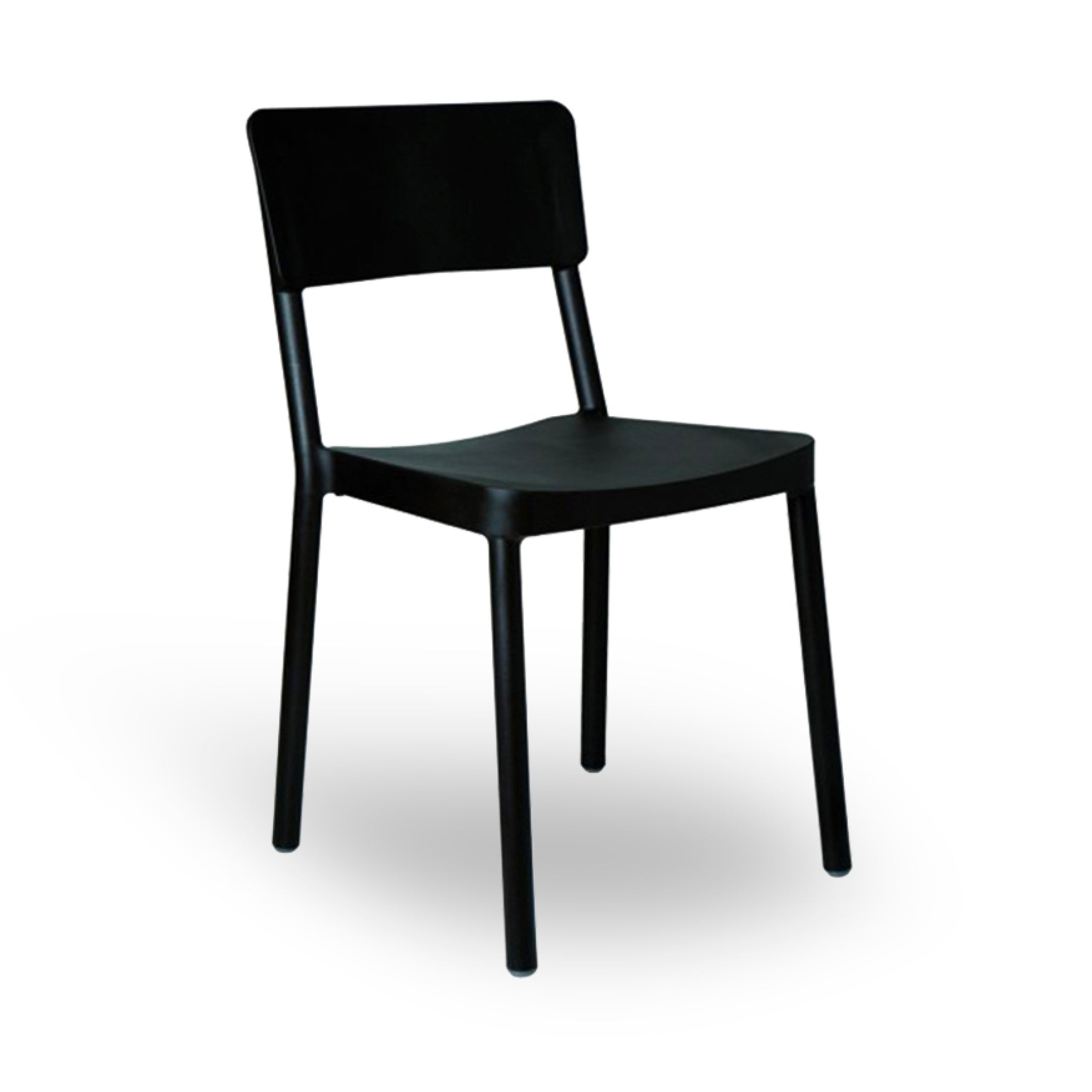 The Lisboa Chair by Resol is a sleek, minimalist black chair featuring a straight rectangular backrest and four cylindrical legs. Crafted sustainably, it suits various settings with its modern style.
