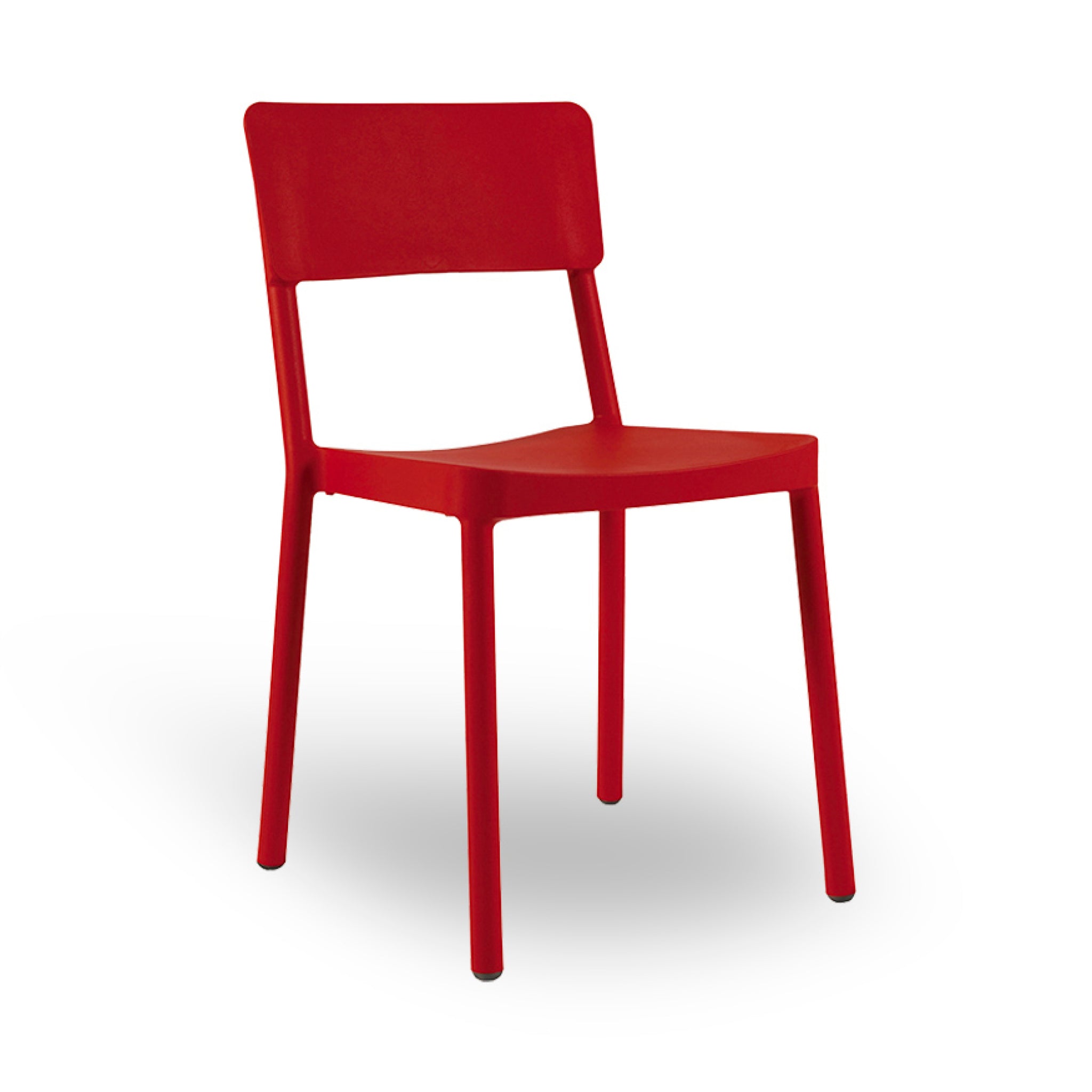 The Lisboa Chair by Resol is a modern, sleek red chair with a straight backrest and four legs, crafted sustainably. It features a smooth surface with UV protection and is shown against a plain white background.