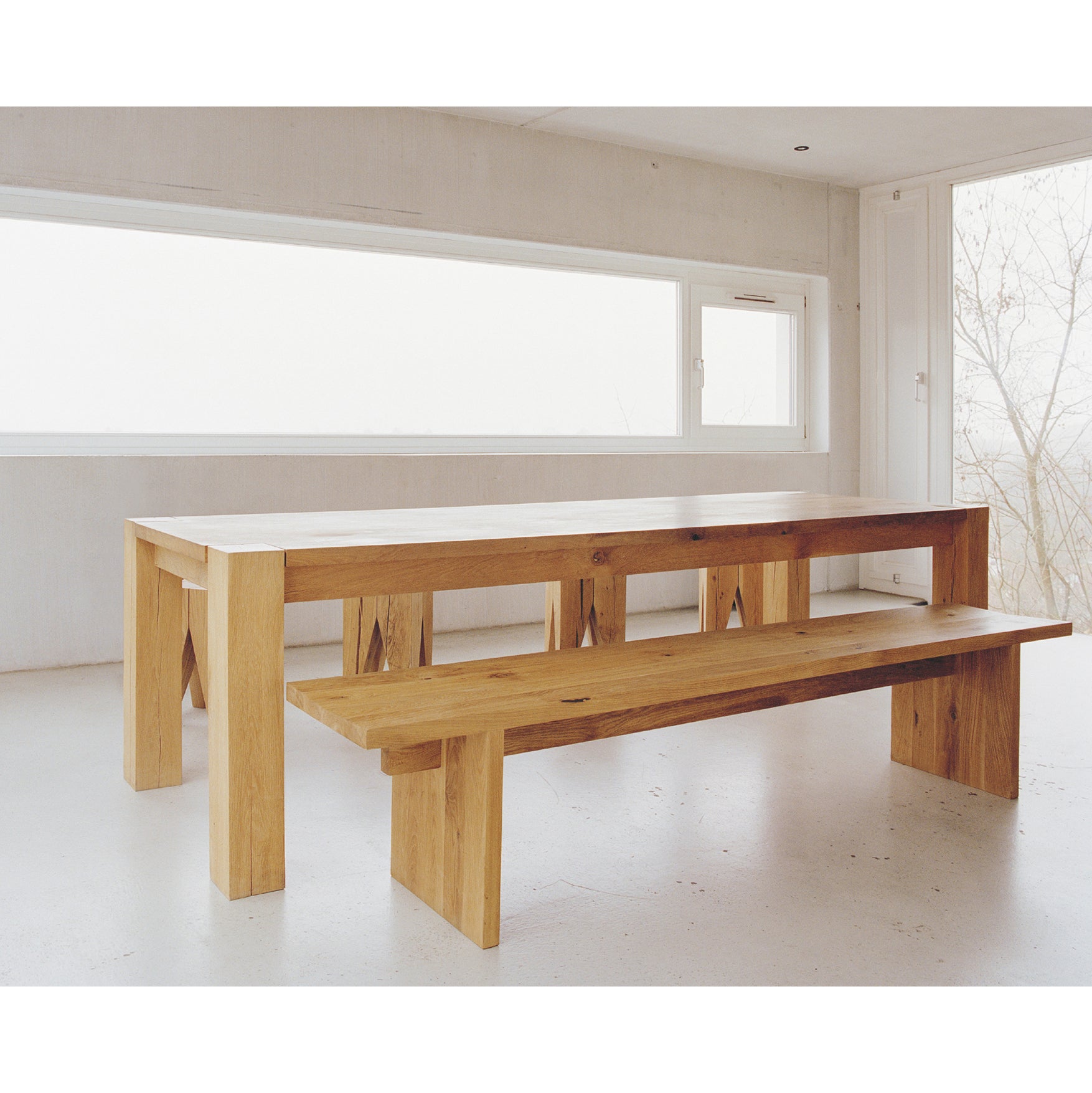 The sides of the BE02 TARO are pushed slightly inward to enhance stability, therefore this bench can be offered in a standard length of up to 118 1/8 inches. The wood is 1 5/8 inch thick and the top tapers toward the middle for comfortable sitting. This bench, with its clean lines, is made of three boards and works well in combination with the tables TA04 BIGFOOT™ and TA02 JAPAN.