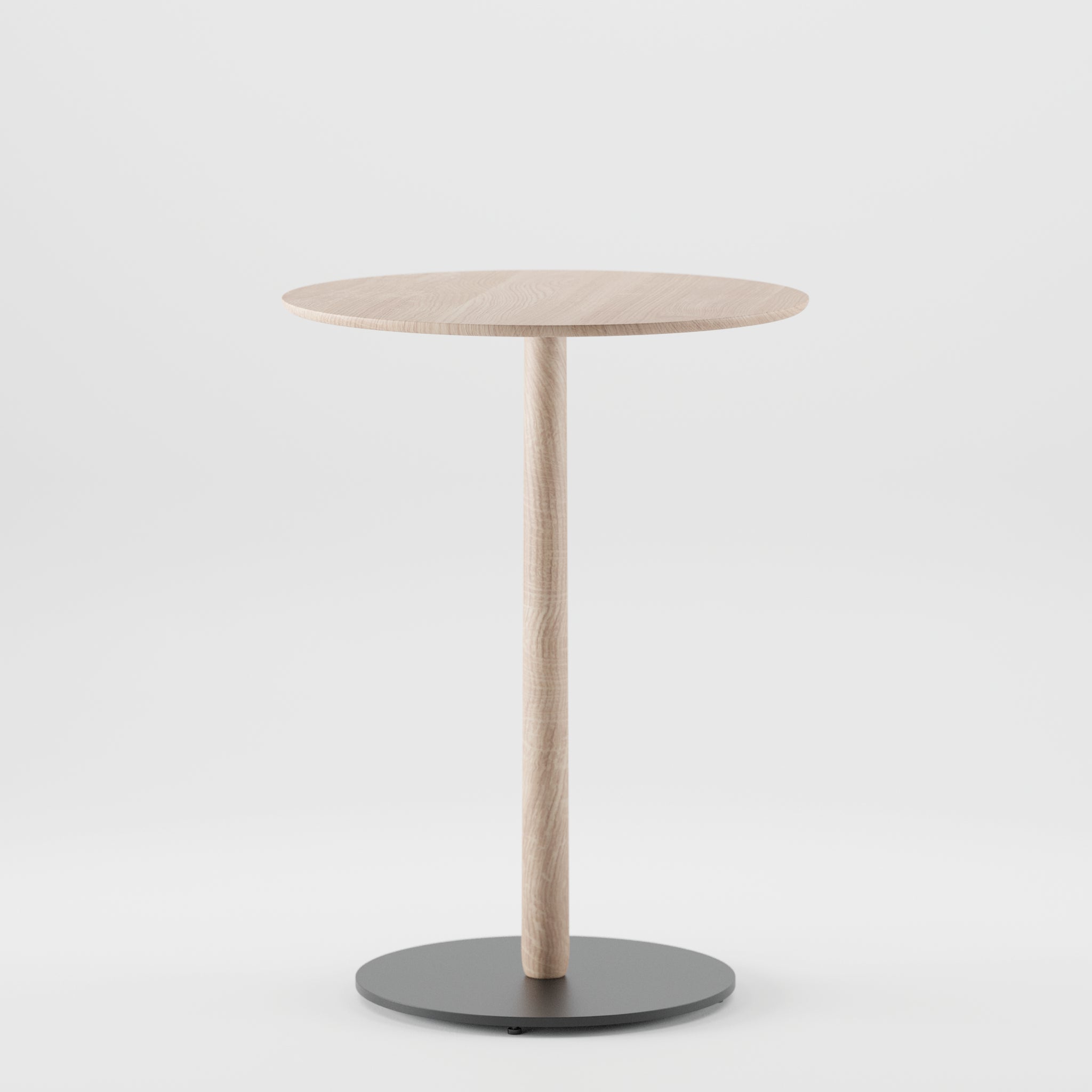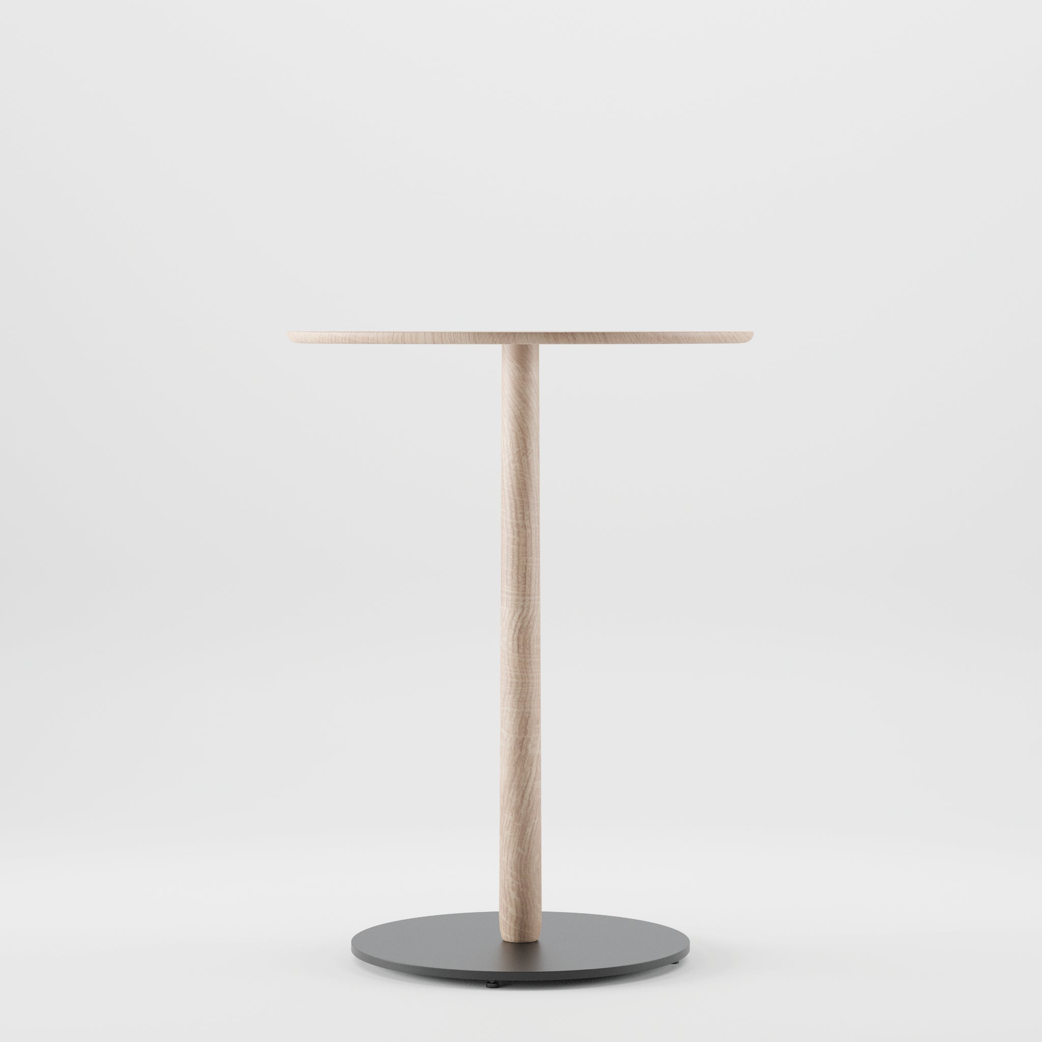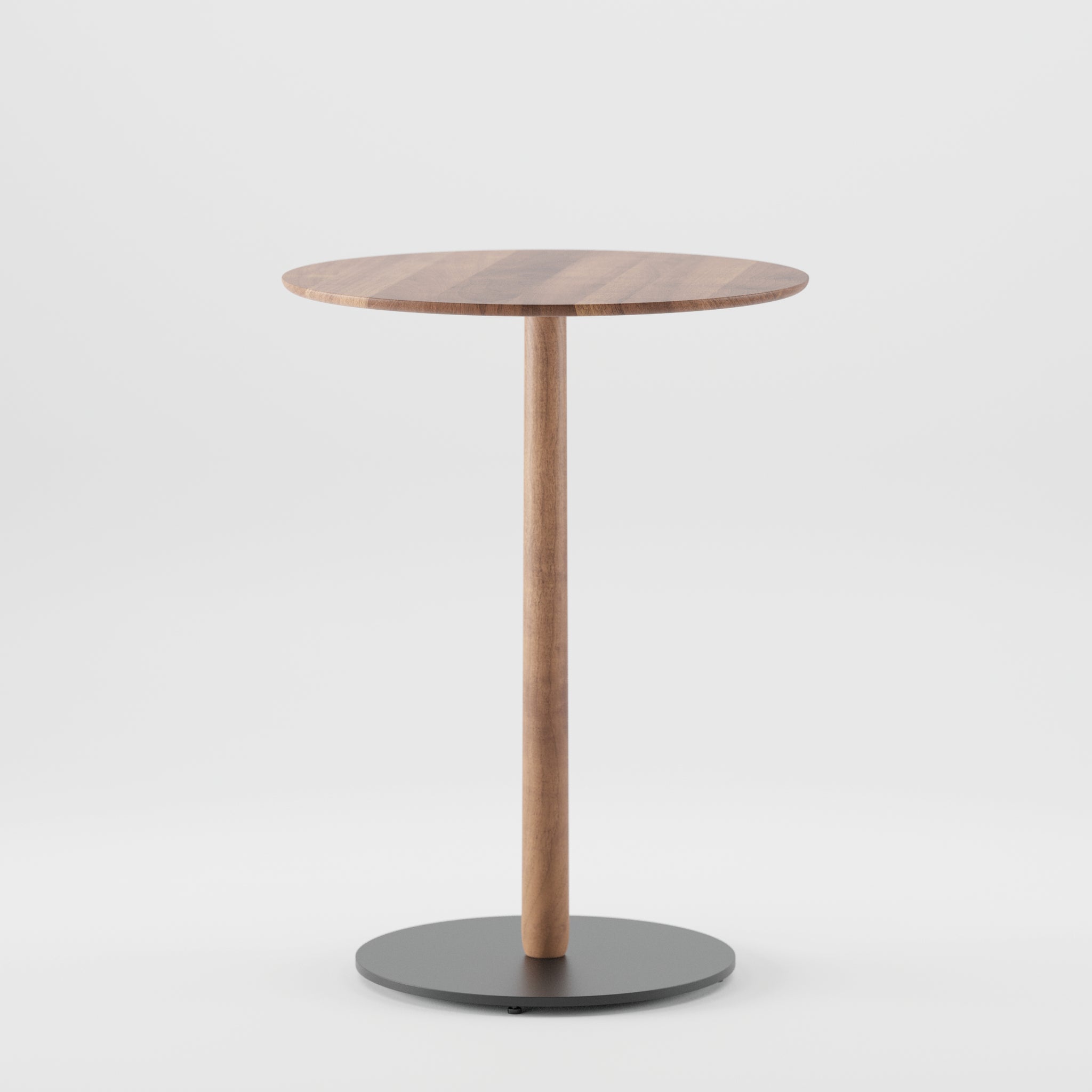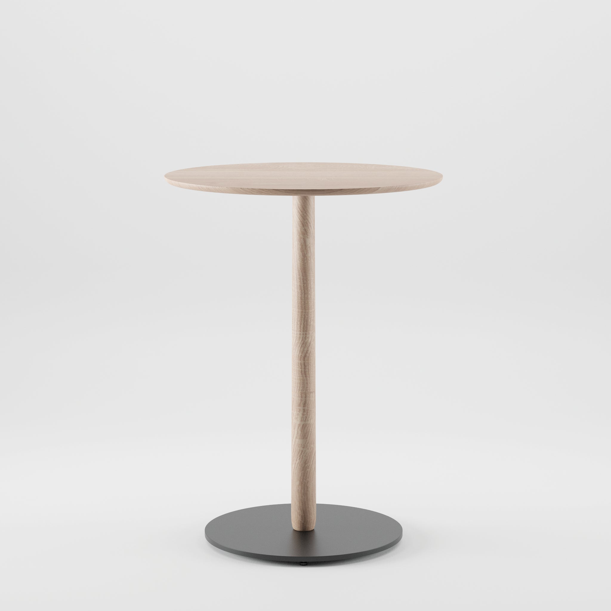 The Bistro B Table by Artisan is a minimalist wooden table, featuring a round top and single central leg made from solid wood. It rests on a circular black metal base and is enhanced by natural oils, all showcased against a plain white background with eco-friendly materials.
