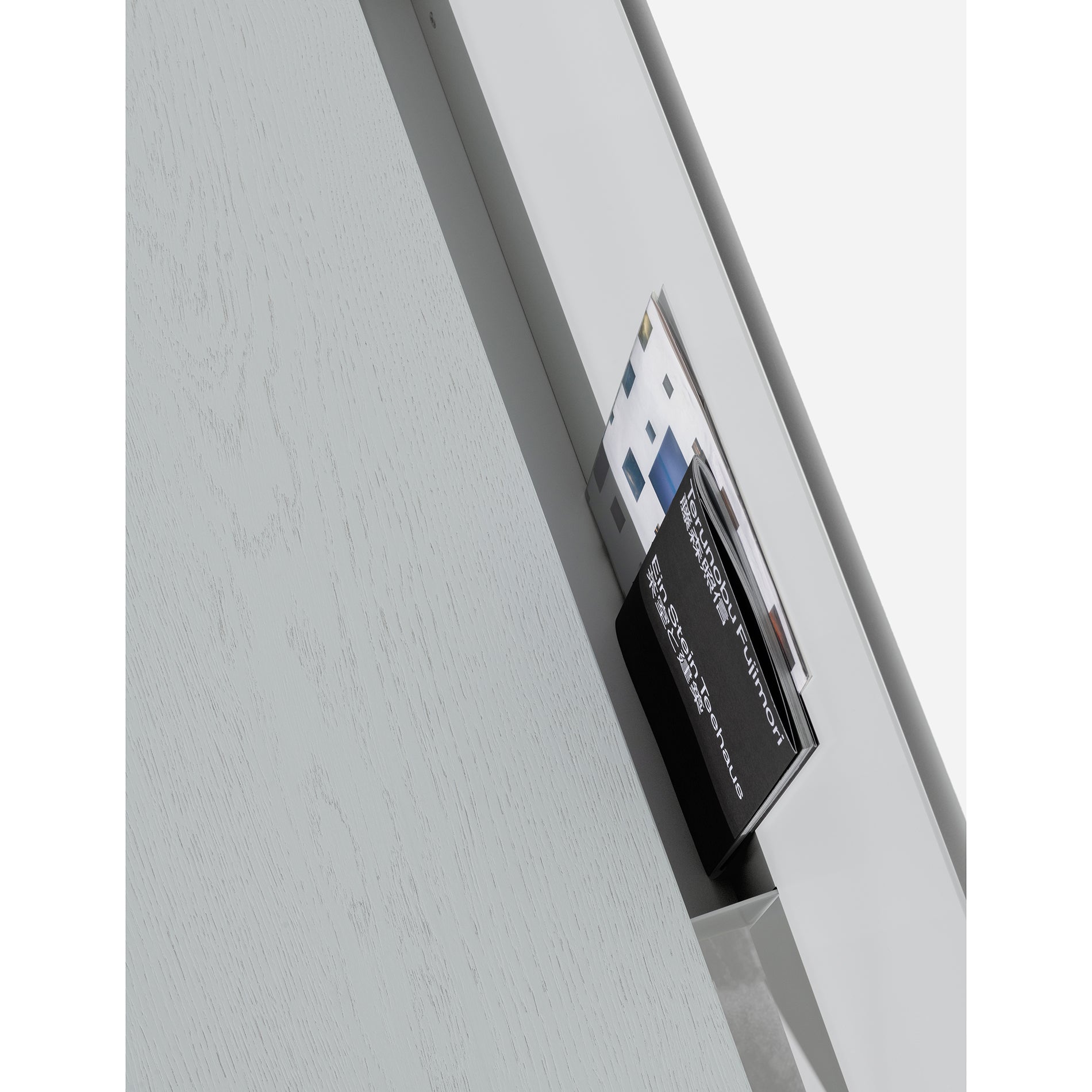 With the balance between working and living spaces being renegotiated, the boundaries between the digital and physical blurring, and space itself at a premium, we require new solutions for work and the workspace. CHAPTER is a reinterpretation of the typology of the bureau and answers this demand in its distinctive way. The result is an understated, wall-mounted item of furniture, reduced in form to lines and surfaces. A fold-up, oak-veneered tabletop covers a compartment for hidden storage. The sloping aluminum rear panel is an exceptional place to feature books, notes, and objects or keep utensils and other materials within reach. Made of single elements, the product is economically packaged, easy to recycle, and straightforward to repair. CHAPTER is an individual work surface, a standing desk, or a sideboard. When arranged in a row, it can be used to create whole workspaces.