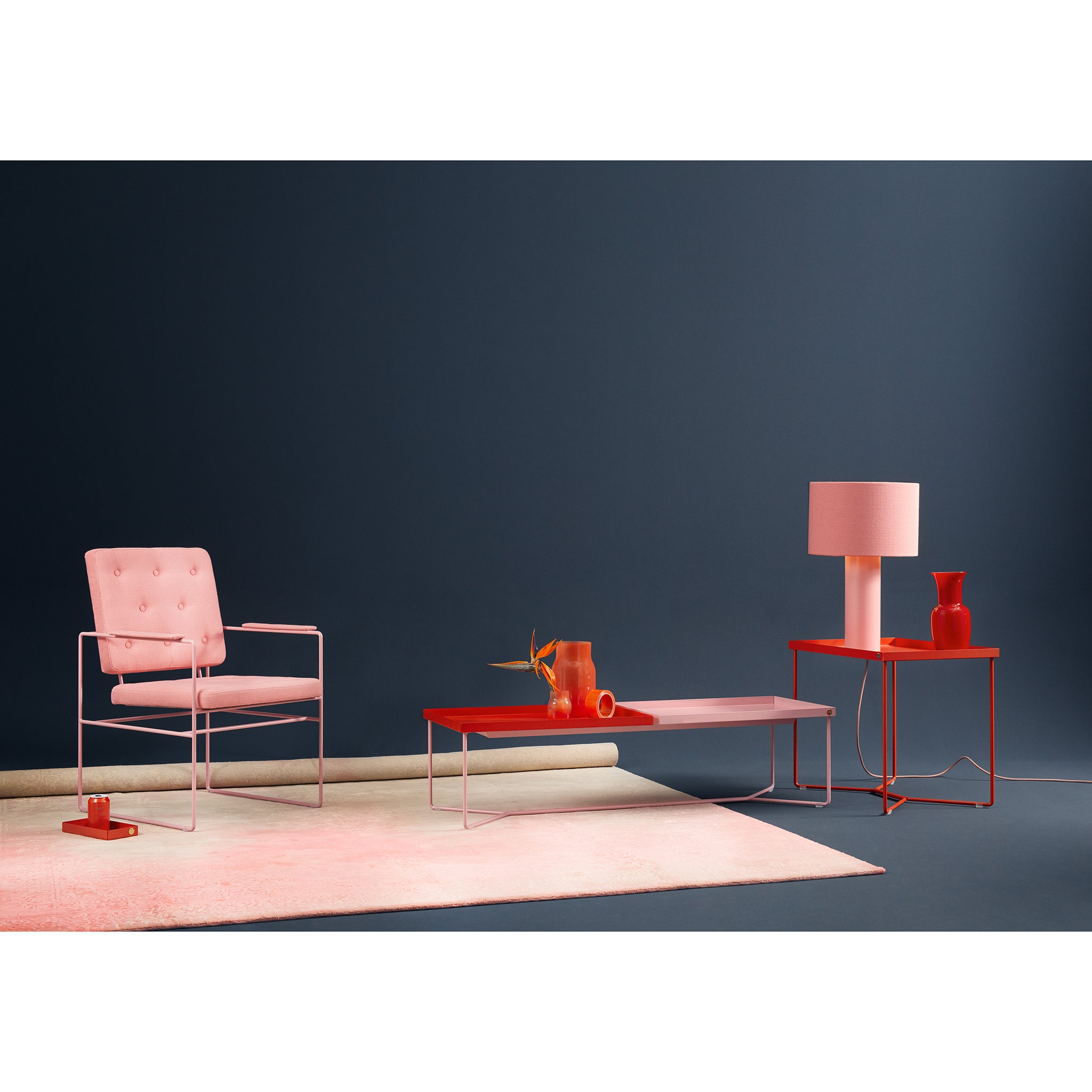 POI DOUBLE coffee table consists of two identical parts which reflect each other and are welded together. The steel frame is bent by hand. The two trays are fixed invisibly to the frame. Available with or without leather inlays.