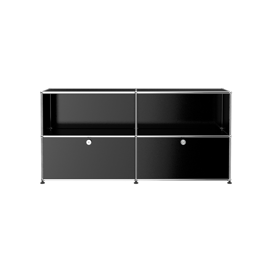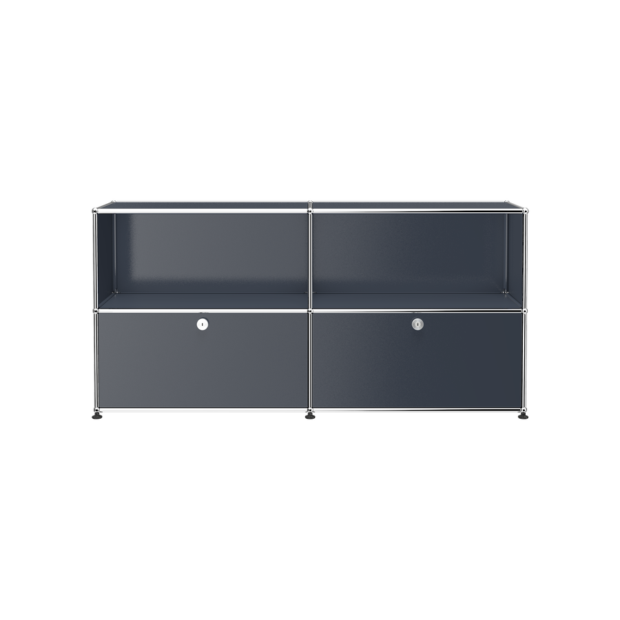 A functional storage credenza with open top sections and two 14"H drop down doors on the bottom that lock with the twist of a coin.